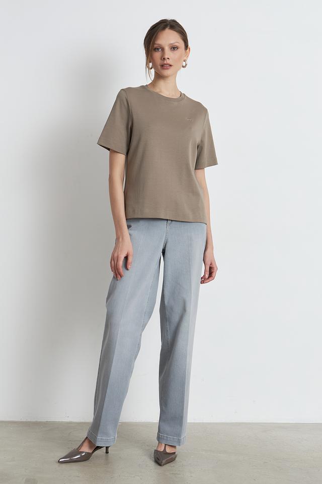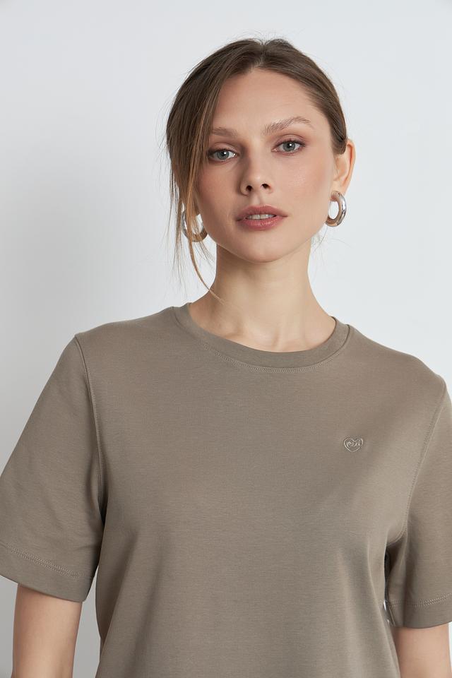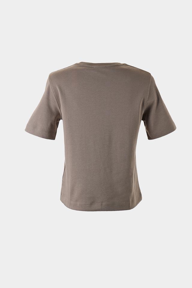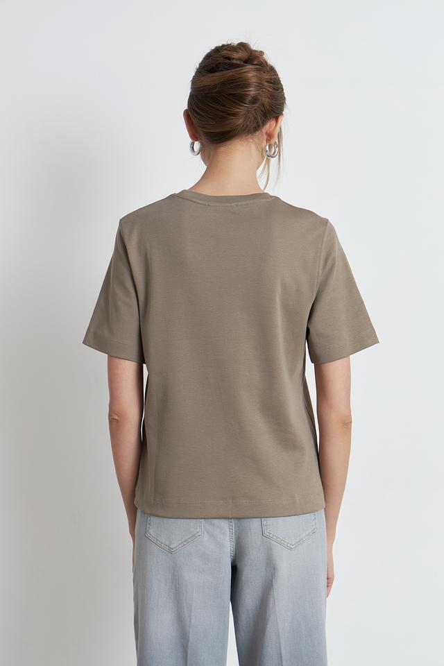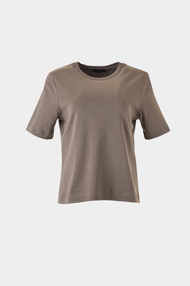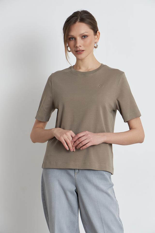 Футболка имеет классический круглый вырез горловины и однотонный хаки цвет. Небольшой логотип бренда, расположенный на груди, добавляет изысканности и узнаваемости. Эта модель станет отличной базой для создания разнообразных образов, от повседневных до более элегантных.