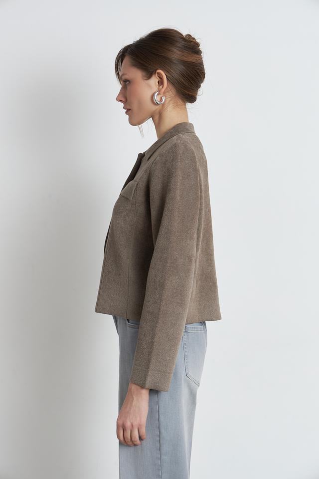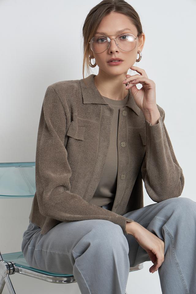 Жакет имеет прямой крой, длинные рукава и воротник. Застежка на пуговицы позволяет регулировать степень прилегания. На полочке расположен накладной карман, добавляющий функциональности и стиля.