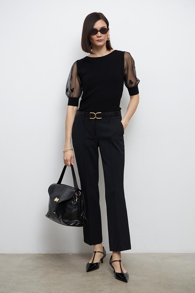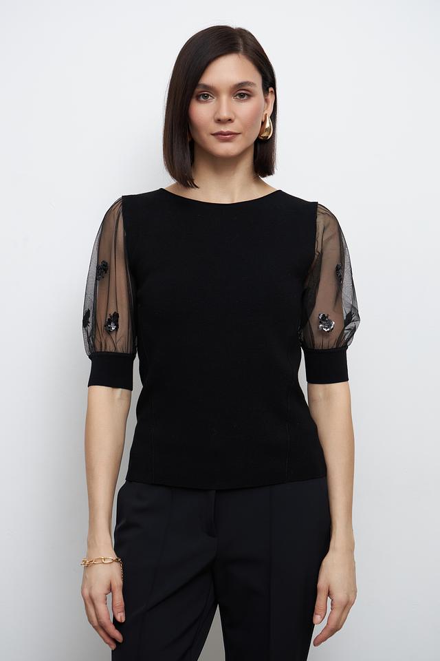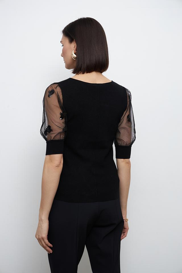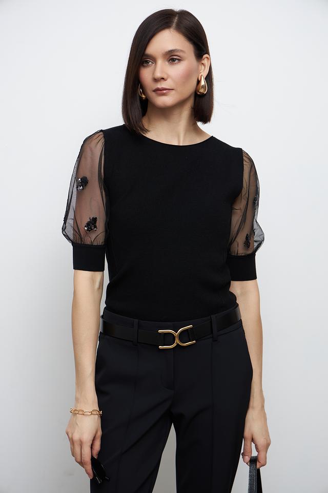 Особенностью модели являются короткие рукава-фонарики, выполненные из полупрозрачной ткани, что придает изделию легкость и изысканность. Пуловер имеет круглый вырез горловины и приталенный силуэт, подчеркивающий фигуру.