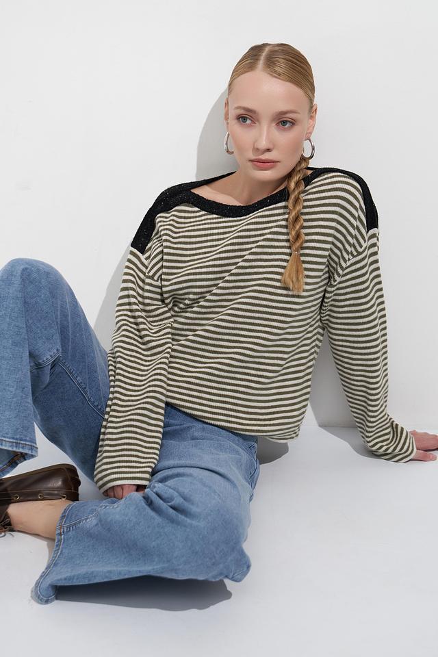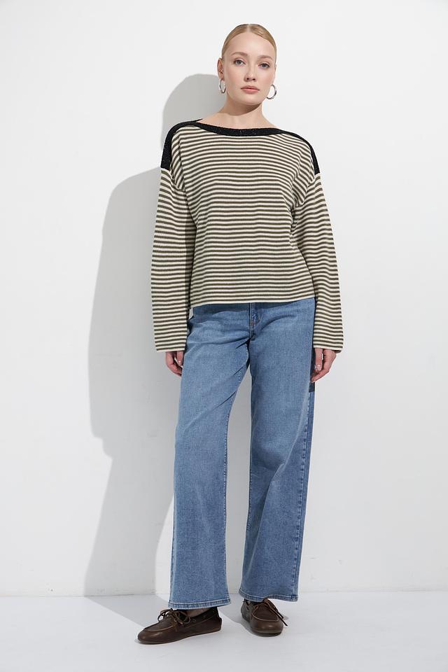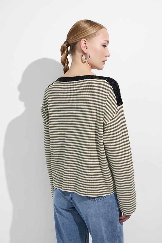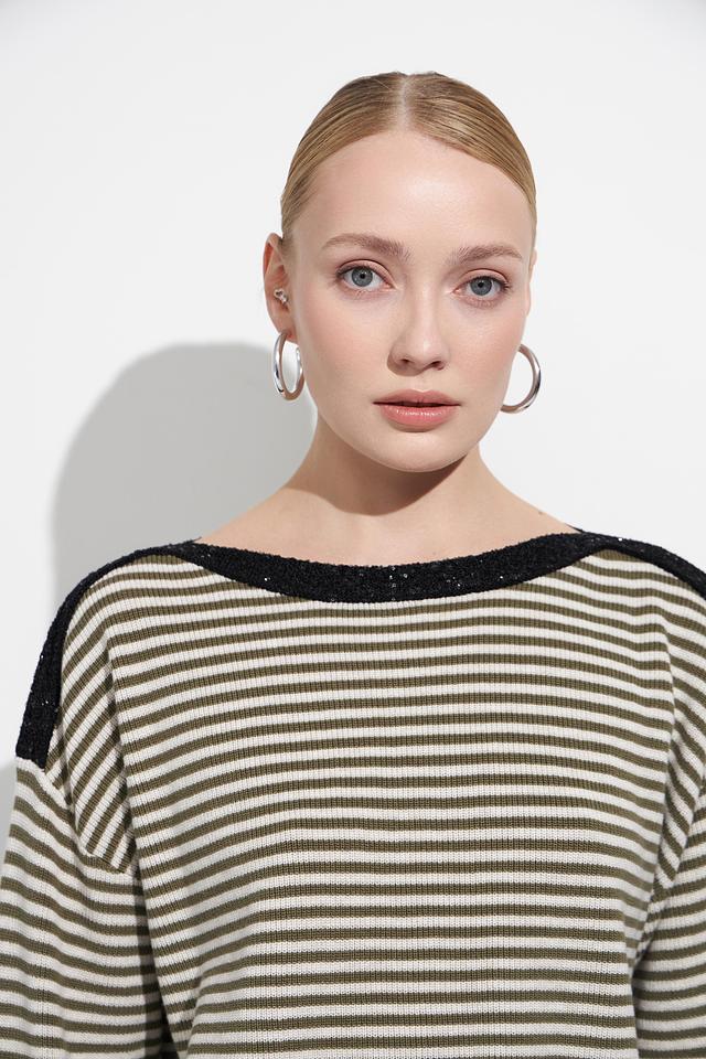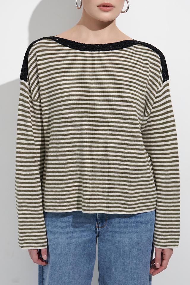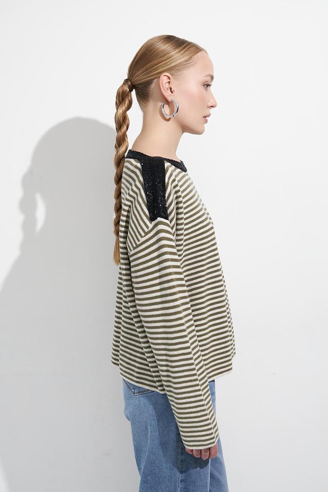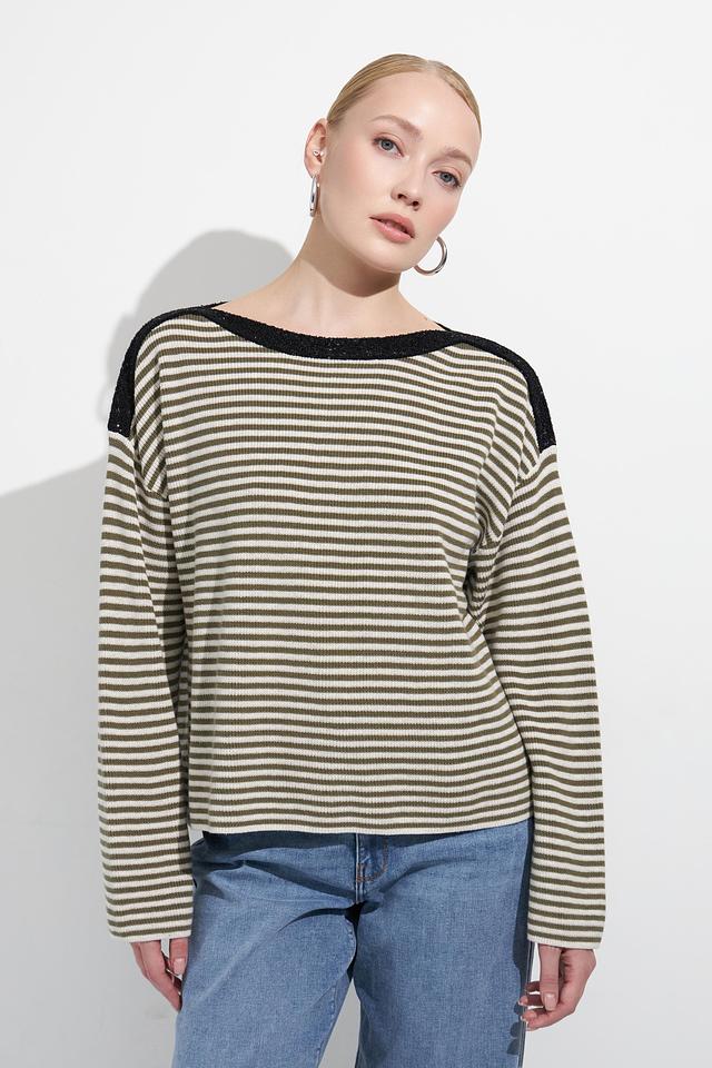 Пуловер имеет классический крой с длинными рукавами и округлым вырезом горловины, которая декорирована сверкающими пайетками. Оливково-зелёная полоска придает изделию свежий и современный вид.