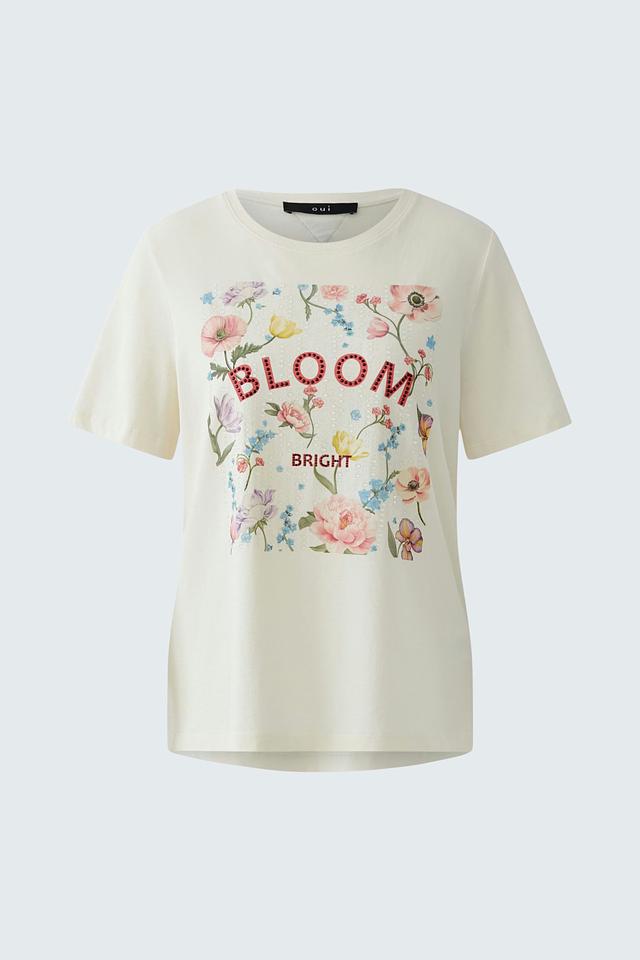 Женская футболка Oui кремового цвета украшена ярким цветочным принтом и надписью "BLOOM BRIGHT". Изготовлена из 100% хлопка, обеспечивая комфорт и воздухопроницаемость. Состав: хлопок 100%