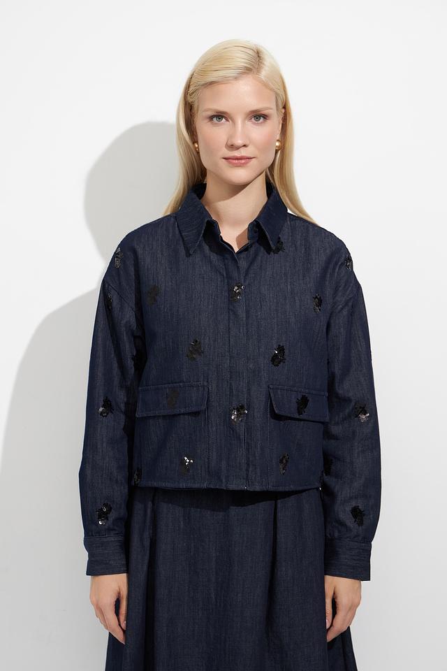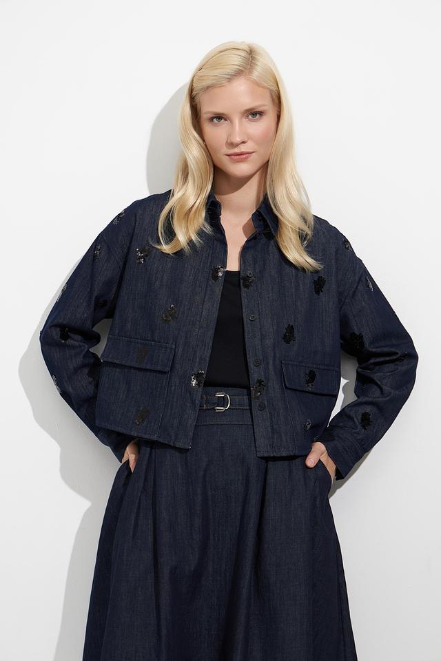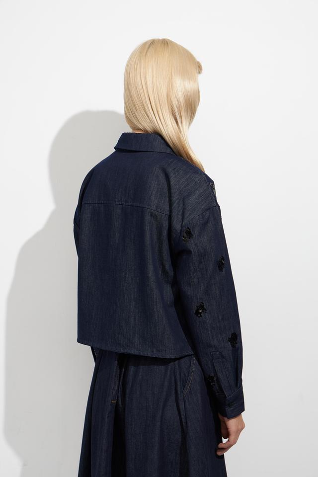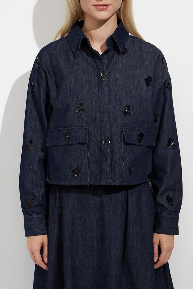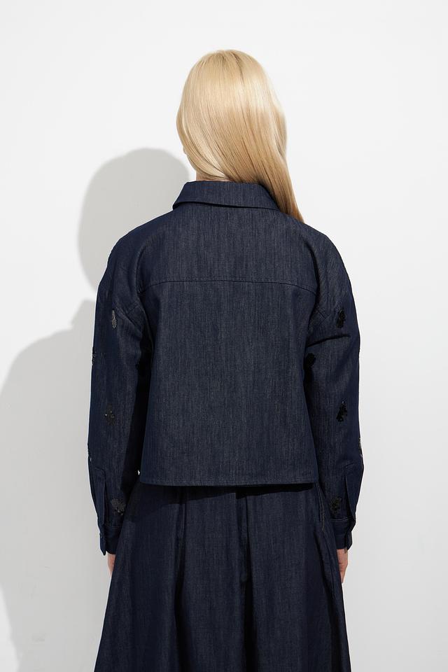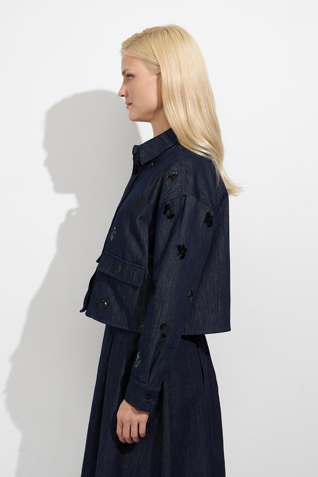 Жакет имеет классический рубашечный крой с длинными рукавами и застежкой на пуговицы. Накладные карманы добавляют практичности, а яркая вышивка в виде цветочных мотивов делает его уникальным и запоминающимся.