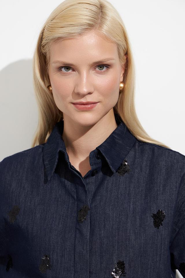 Джинсовый жакет Oui синего цвета, украшенный яркой вышивкой. Модель имеет рубашечный крой, застежку на пуговицы и накладные карманы. Изготовлен из хлопка с добавлением полиэстера. Состав: хлопок 98%, полиэстер 2%