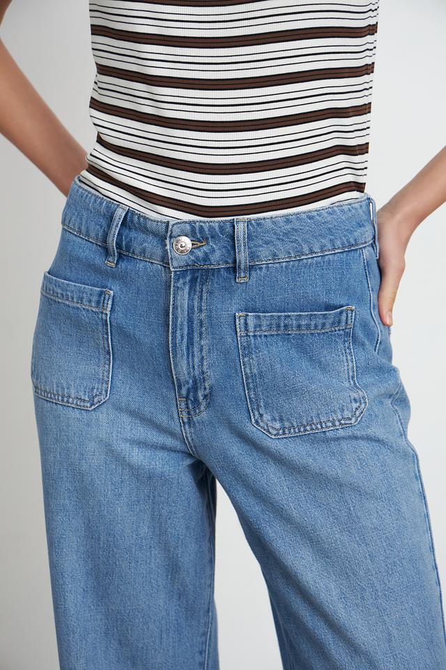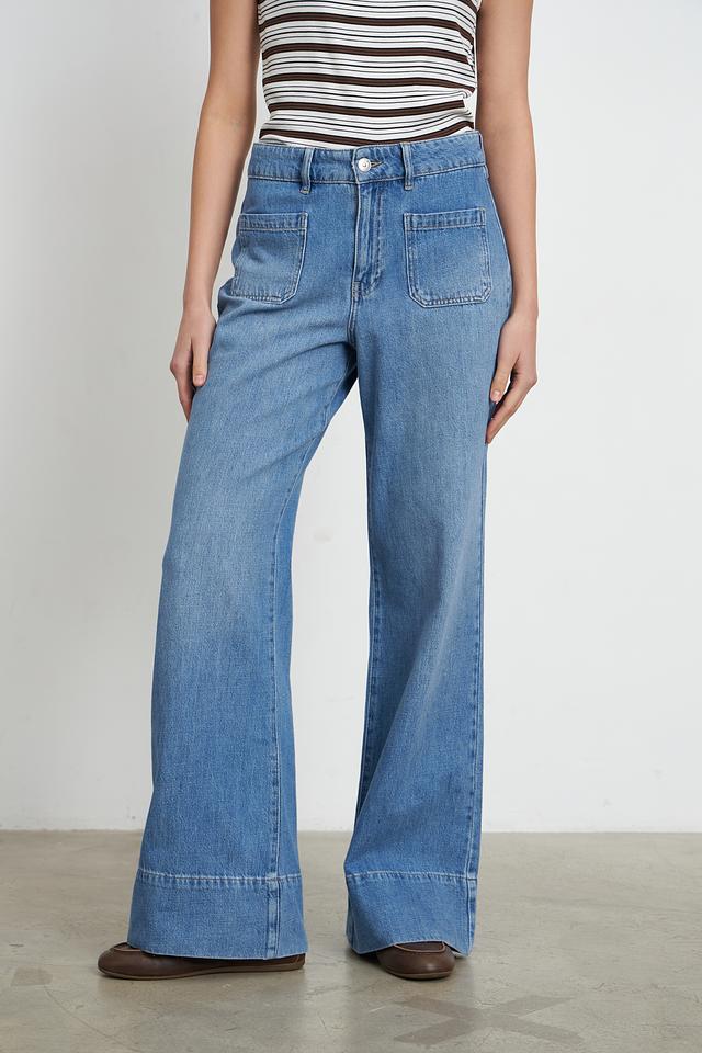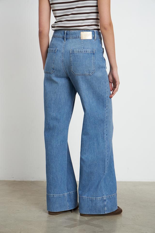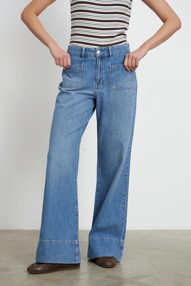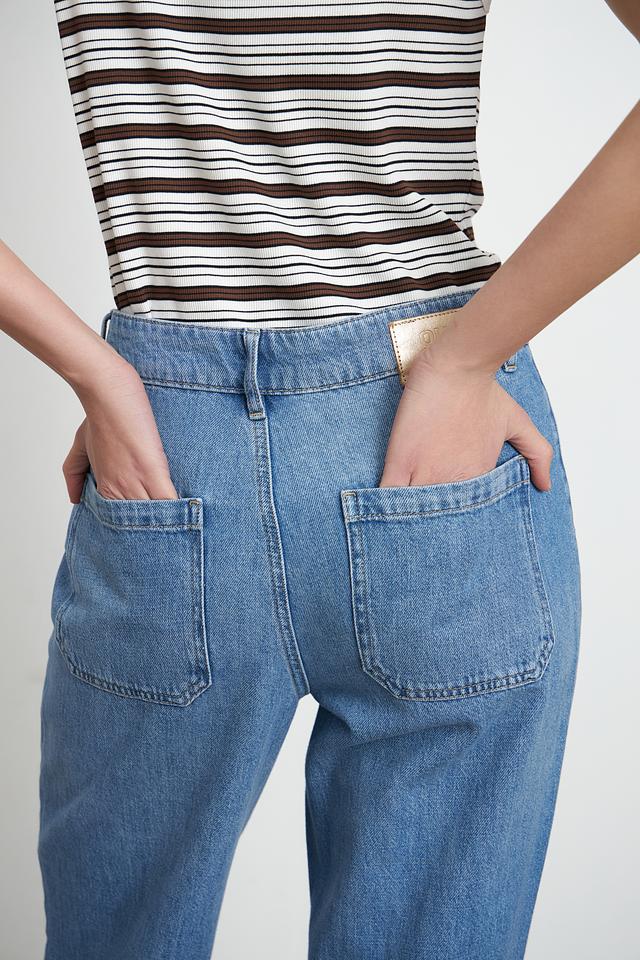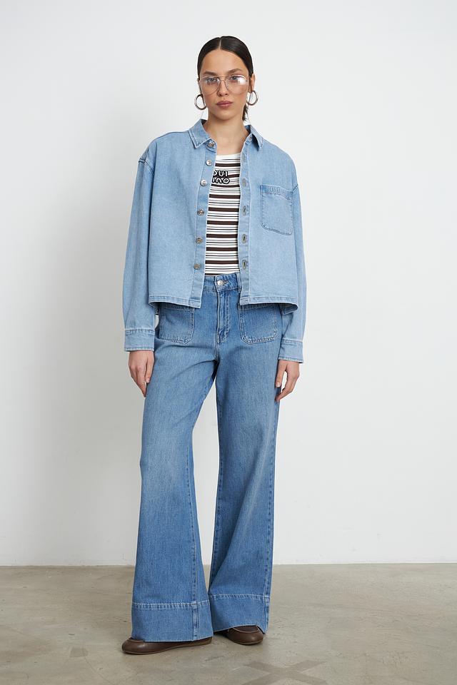 Джинсы имеют классический голубой цвет и прямой крой, расширяющийся к низу, создавая эффектный силуэт. Модель дополнена функциональными карманами спереди и сзади, а также аккуратной металлической фурнитурой.