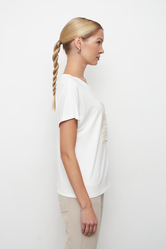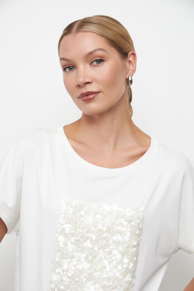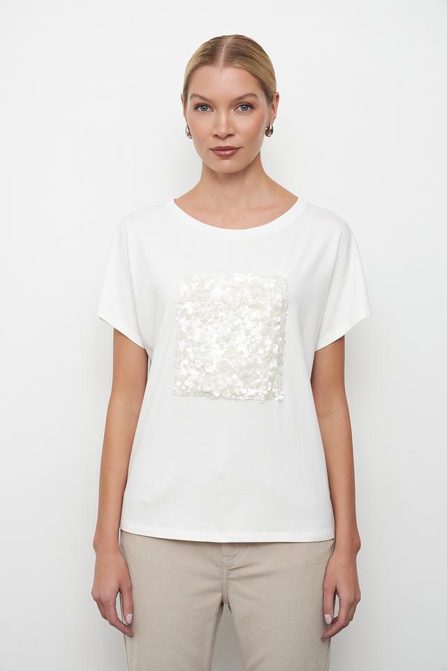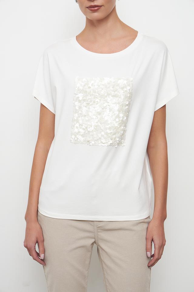 Эта стильная футболка от бренда Oui станет отличным дополнением к вашему гардеробу. Футболка выполнена в белом цвете и украшена квадратным декором из мерцающих пайеток, что придает ей особый шарм и элегантность.