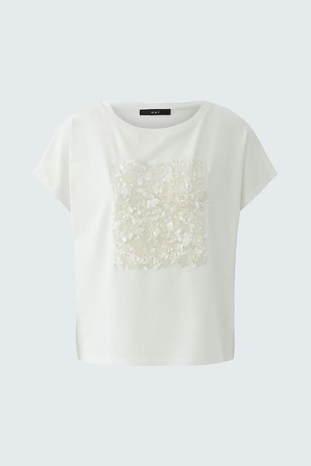 Эта стильная футболка от бренда Oui станет отличным дополнением к вашему гардеробу. Футболка выполнена в белом цвете и украшена квадратным декором из мерцающих пайеток, что придает ей особый шарм и элегантность.