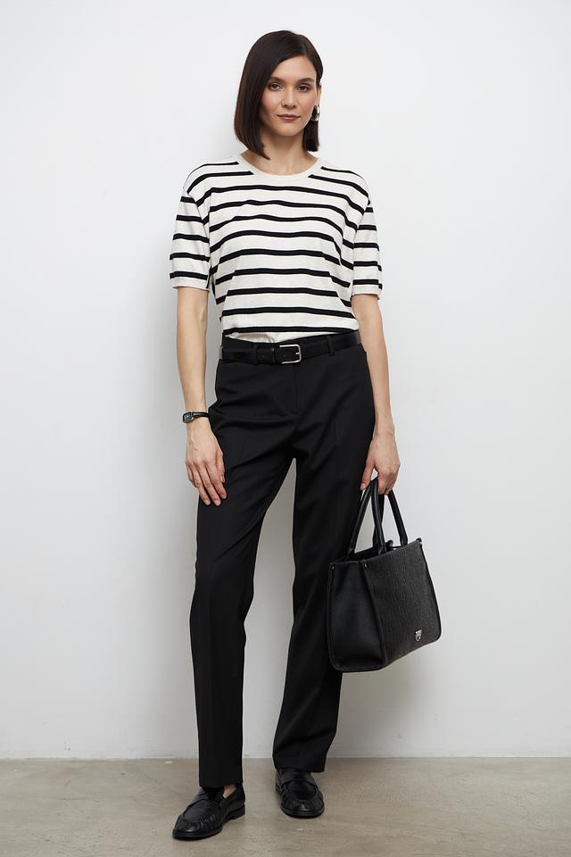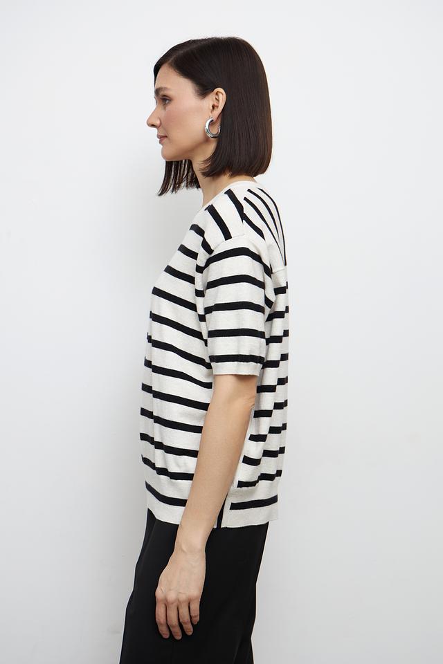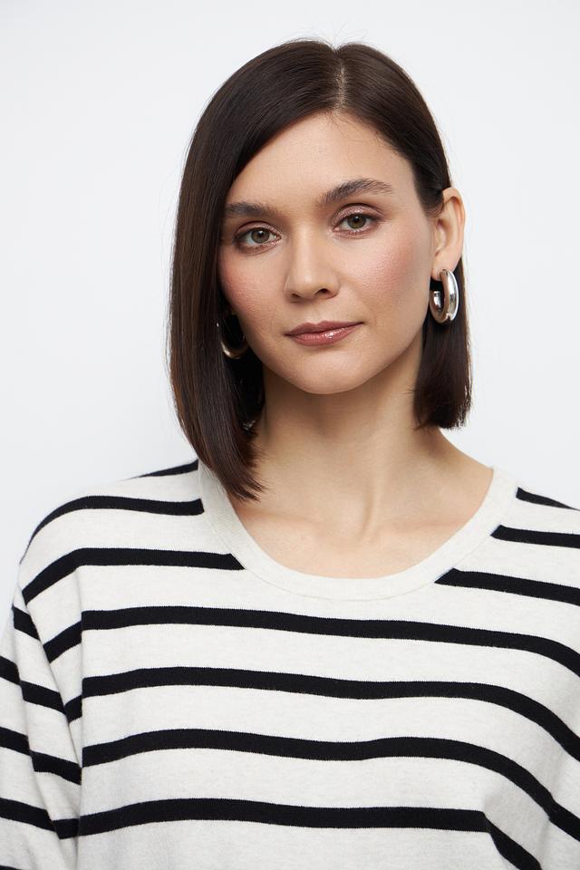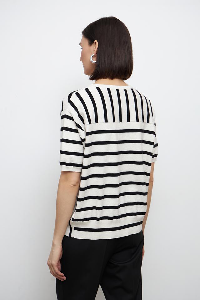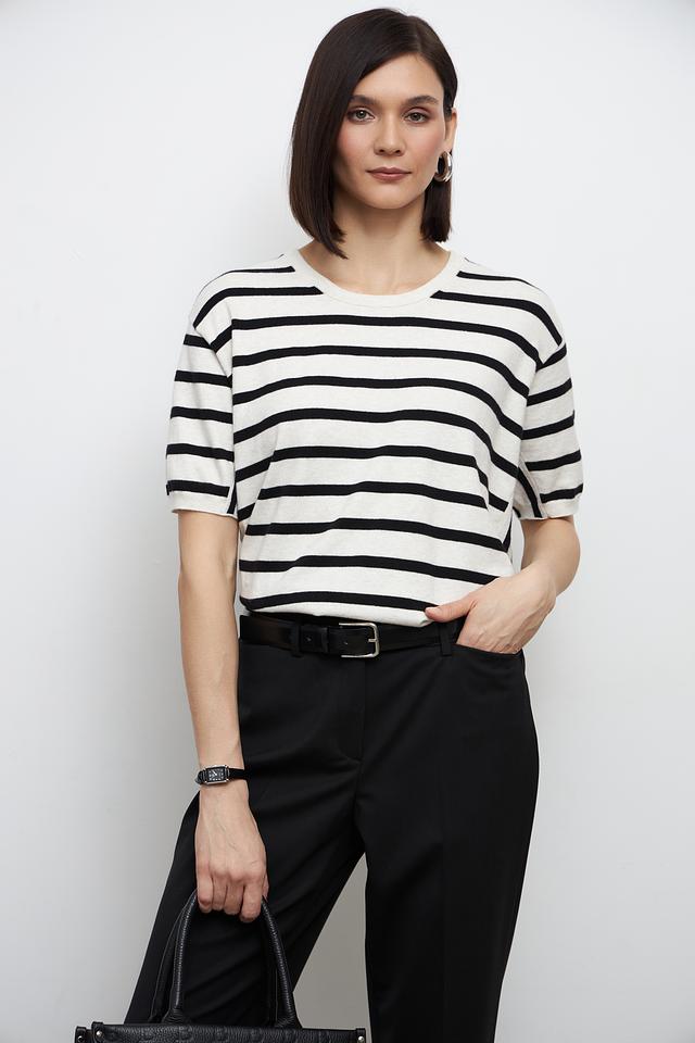 Этот стильный пуловер от бренда Oui выполнен в классическом дизайне с горизонтальной полоской бежевого и чёрного цветов. Модель имеет прямой крой, короткий рукав и округлый вырез горловины, что делает её универсальной и удобной в носке.