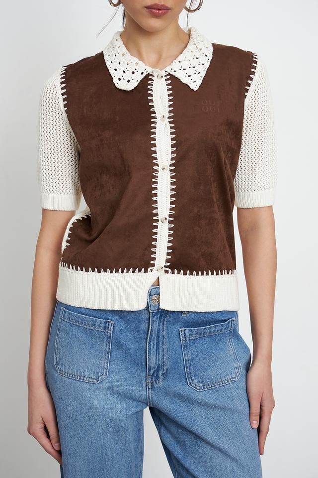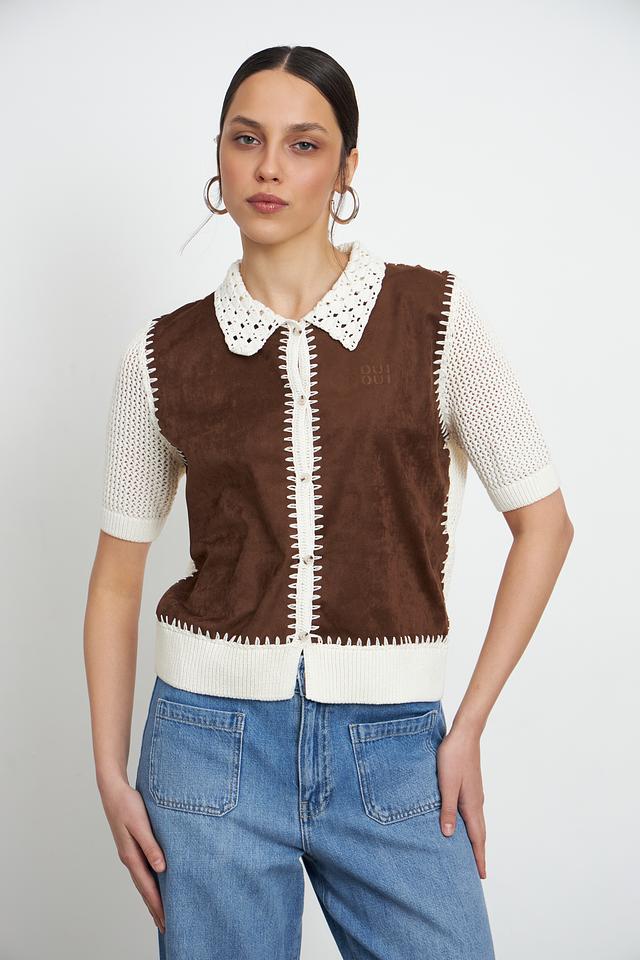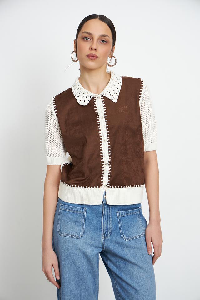 Жакет от Oui коричневого цвета с короткими рукавами и вязаным воротником. Модель выполнена из фактурного материала и дополнена застёжкой на пуговицы и декоративной бахромой. Состав: хлопок 100%