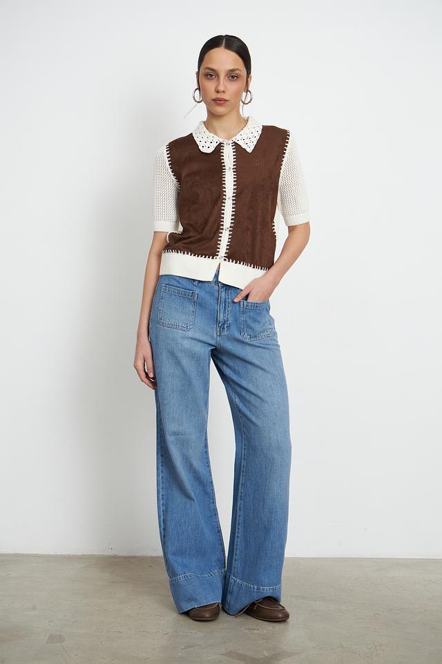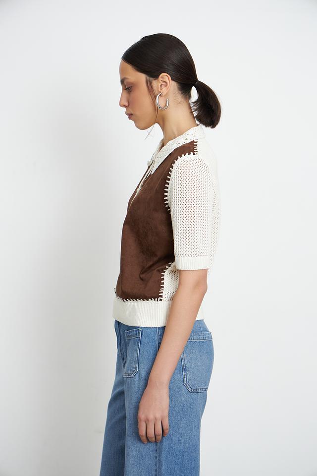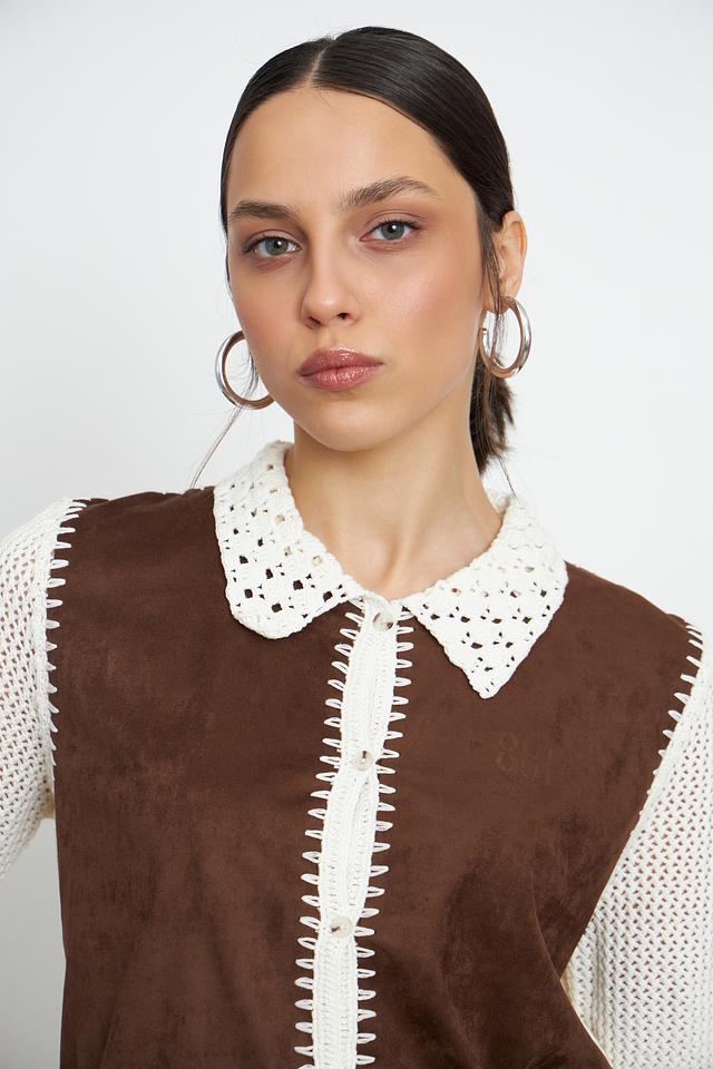 Особенностью модели является вязаный воротник и передняя часть, выполненные в молочно-белом цвете. Застёжка на пуговицы позволяет регулировать степень прилегания, а фактурный материал придает жакету особый шарм.
