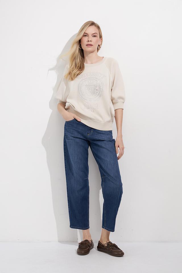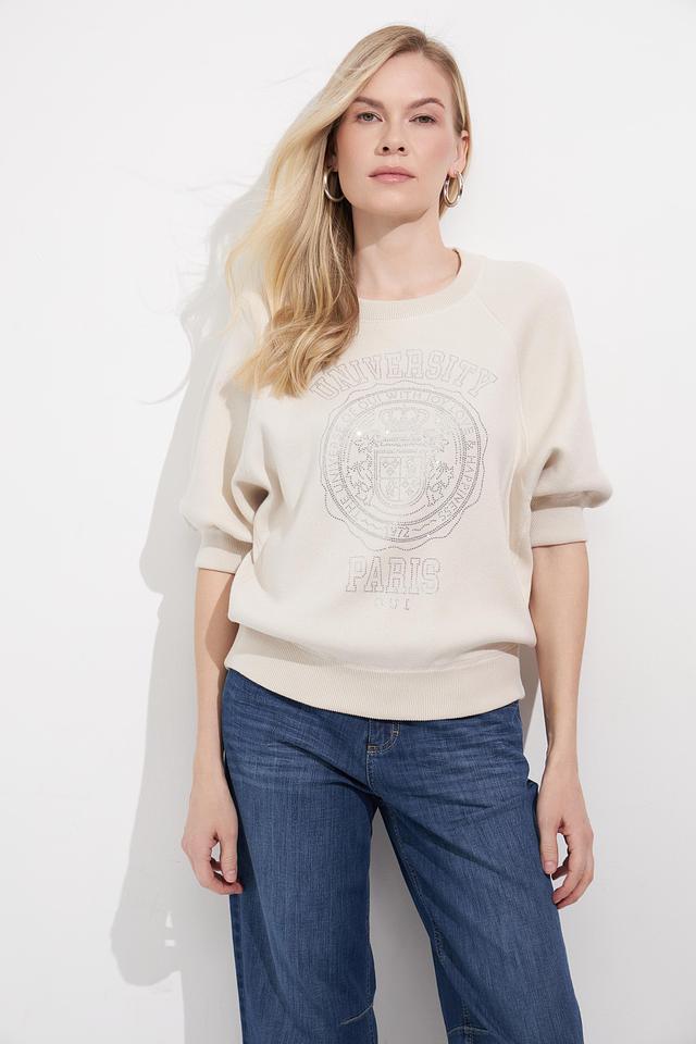 Этот стильный пуловер от бренда Oui выполнен в нежном бежевом цвете и украшен эффектным принтом с надписью "University of Paris 1972". Модель имеет свободный крой, который обеспечивает комфорт в носке, и рукава три четверти, что делает его универсальным для разных сезонов.