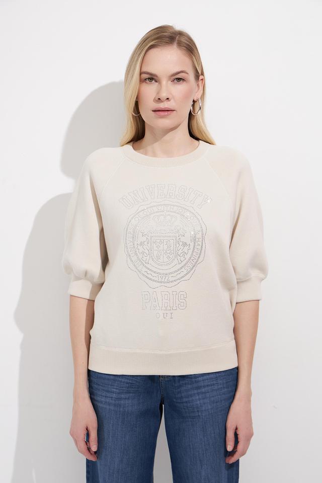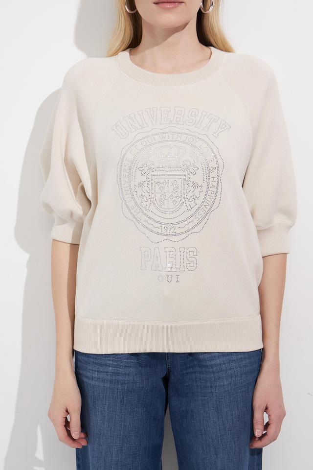 Бежевый пуловер от Oui с оригинальным принтом "University of Paris 1972" станет стильным дополнением к вашему гардеробу. Модель выполнена из мягкого хлопка и имеет удобный крой с рукавами 3/4. Состав: хлопок 100%