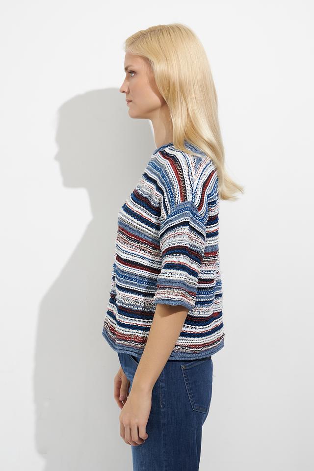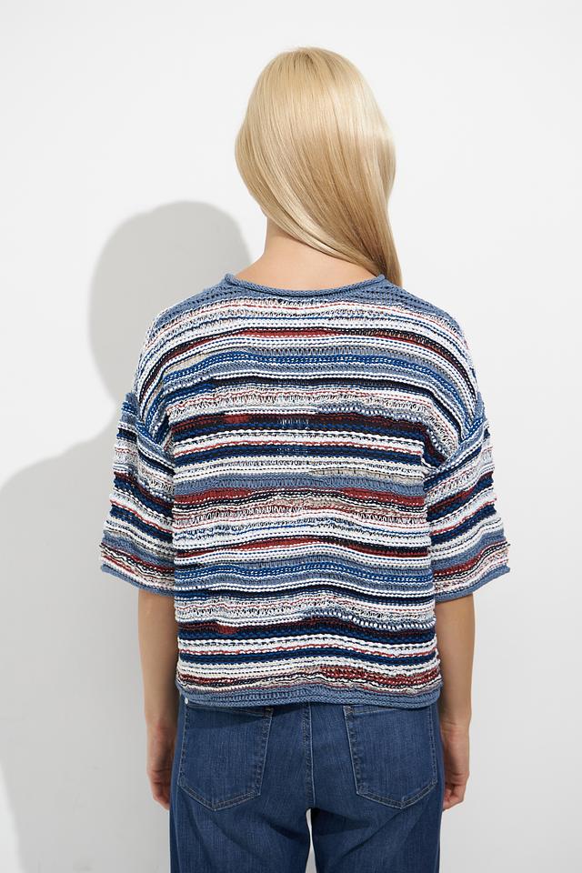 Пуловер имеет свободный крой, который обеспечивает свободу движений и комфорт при носке. Округлый вырез горловины и короткие рукава делают его идеальным для теплой погоды или для создания многослойных образов.