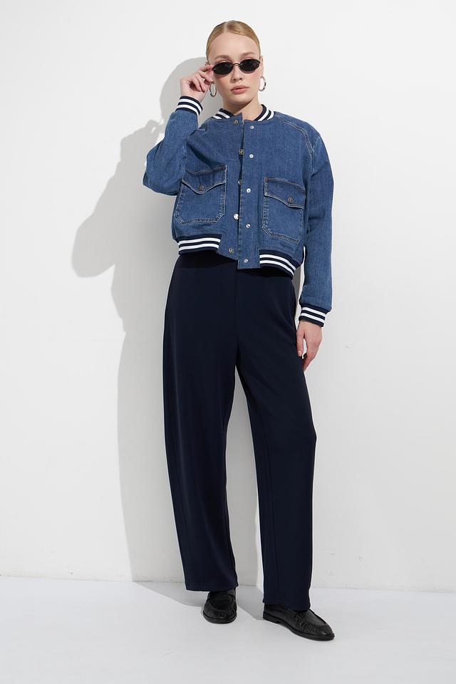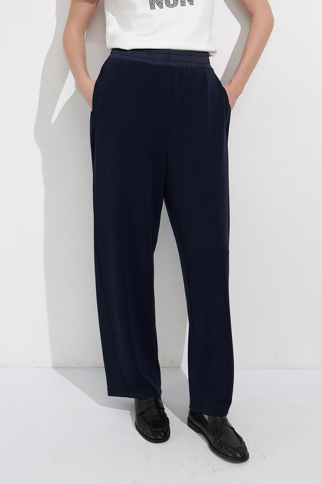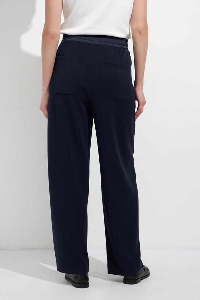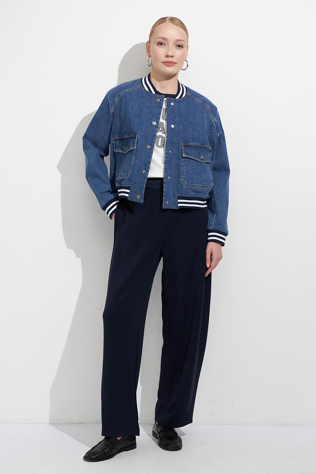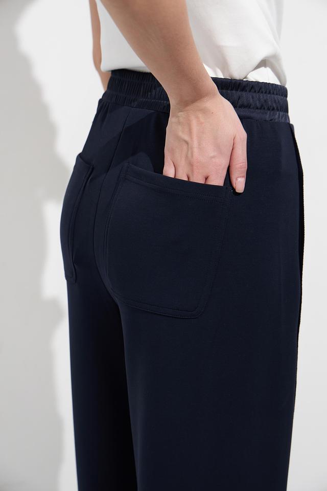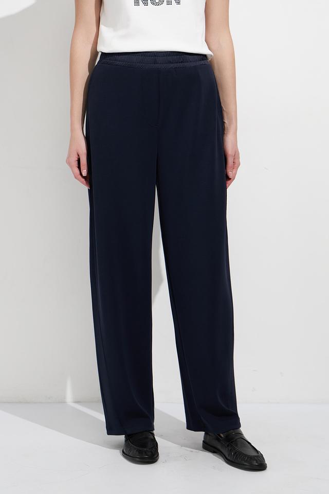 Женские брюки Oui тёмно-синего цвета с контрастными боковыми полосками. Модель выполнена из мягкой вискозы с добавлением полиэстера и эластана для комфорта и хорошей посадки. Состав: вискоза 55%, полиэстер 41%, эластан 4%