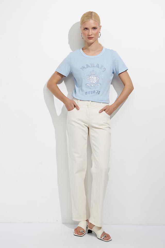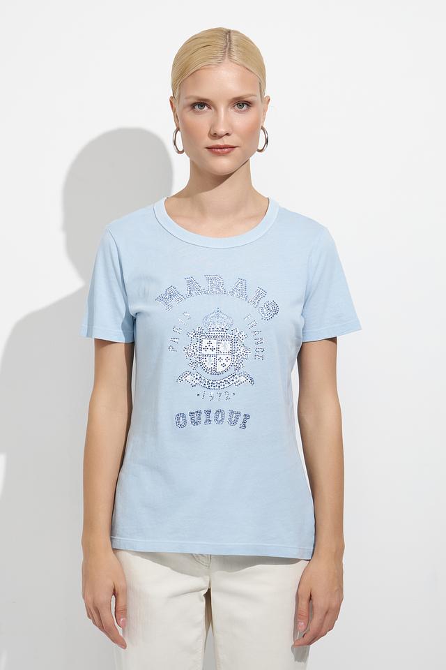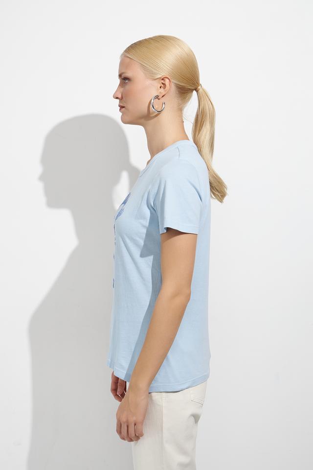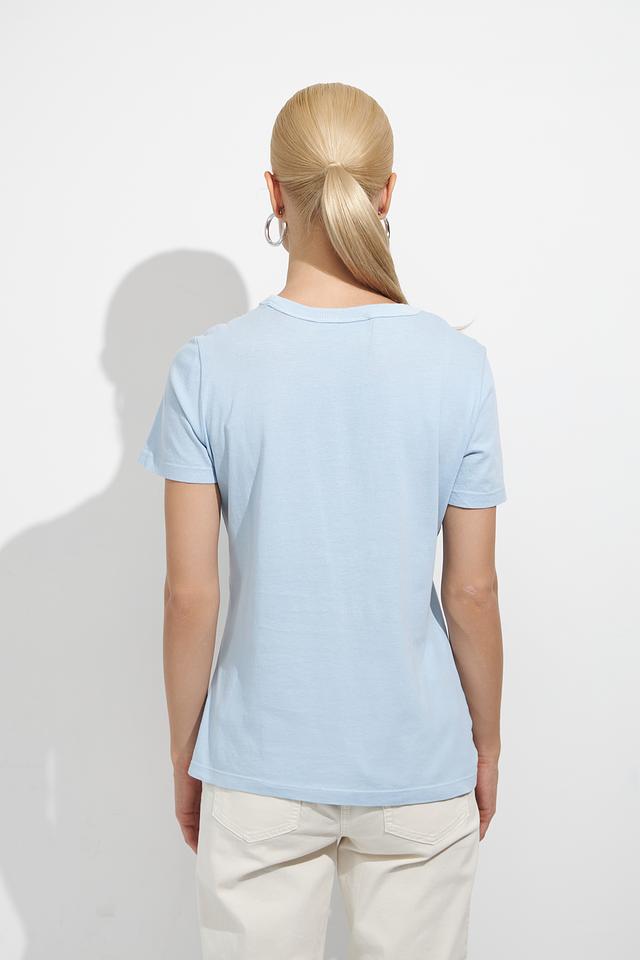 Футболка имеет классический прямой крой, который подходит для любой фигуры. Голубой цвет делает её универсальным элементом гардероба, легко сочетающимся с различными стилями одежды.