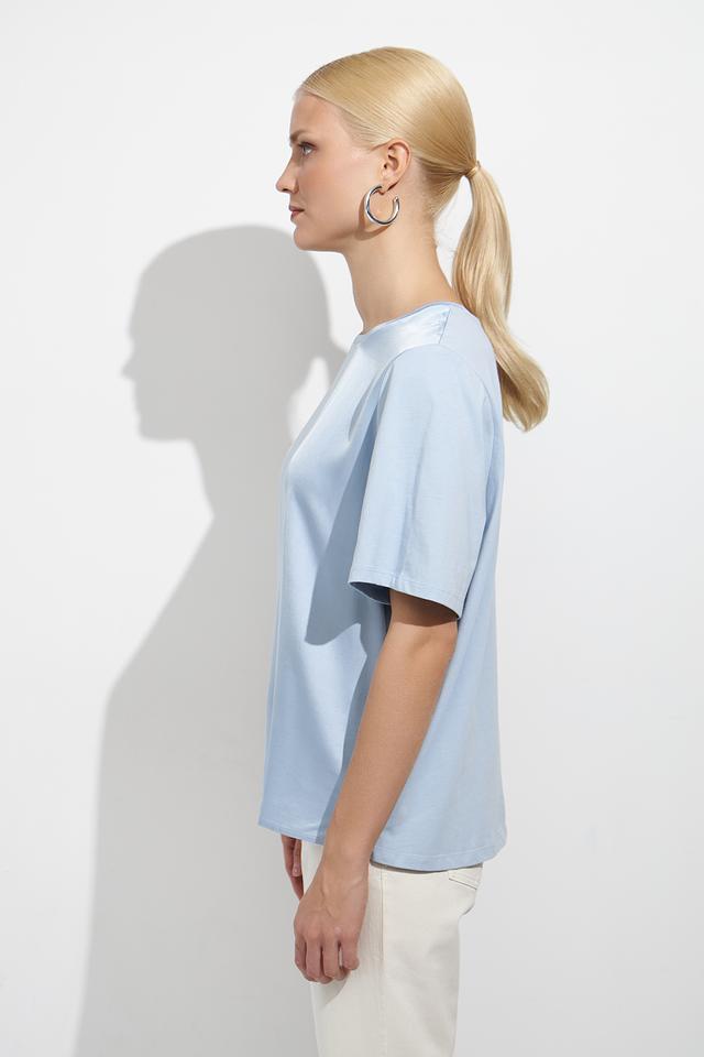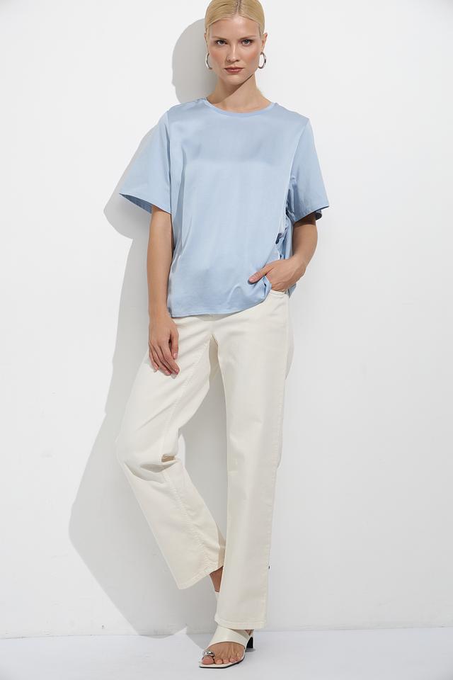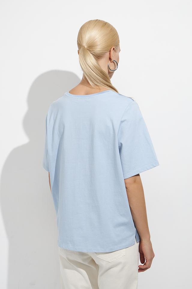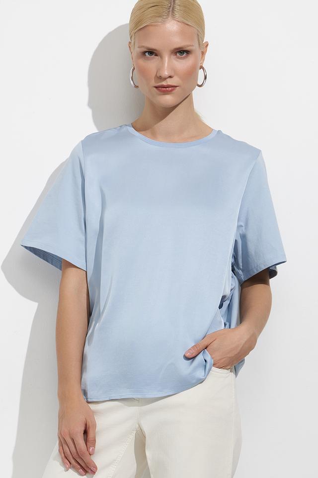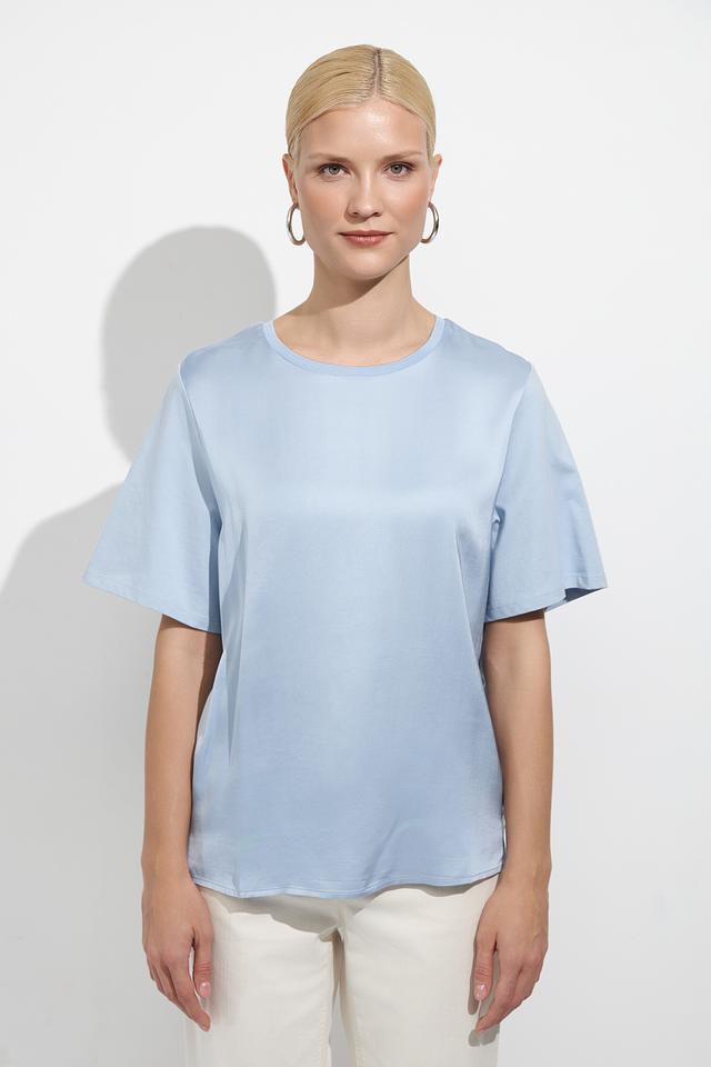 Модель отличается короткими рукавами и классическим круглым вырезом горловины. Нежный голубой цвет блузы легко сочетается с различными элементами гардероба, позволяя создавать разнообразные стильные образы.