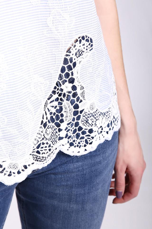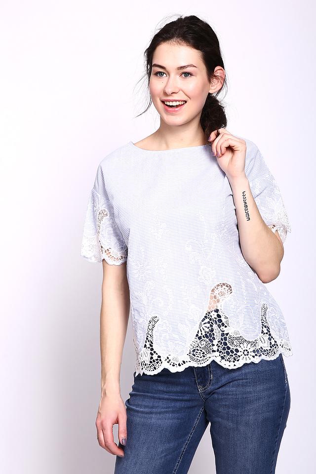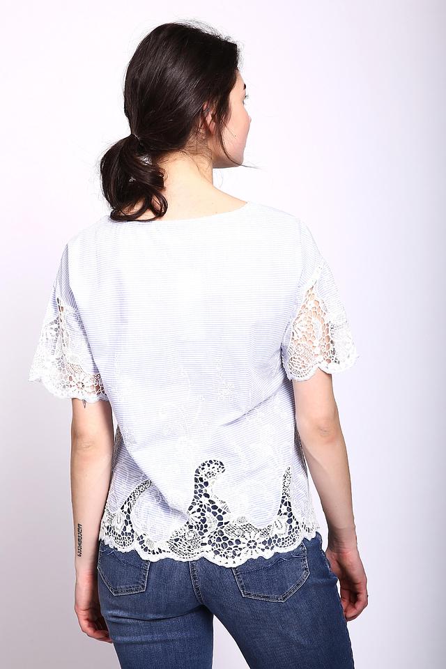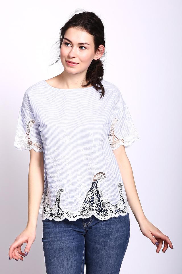 Блуза имеет короткие рукава, отделанные изящным кружевом. Кружево также украшает нижнюю часть блузы, придавая ей романтичный и женственный вид.