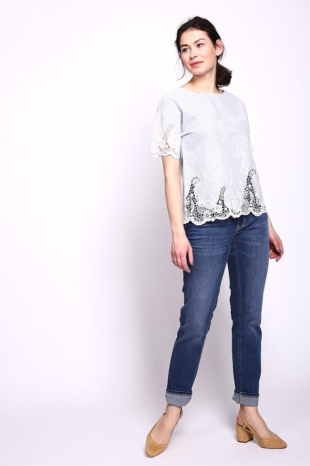 Голубая блуза от Oui с короткими рукавами и отделкой из кружева. Лёгкая и воздушная модель из 100% хлопка идеально подойдёт для создания летних образов. Состав: хлопок 100%