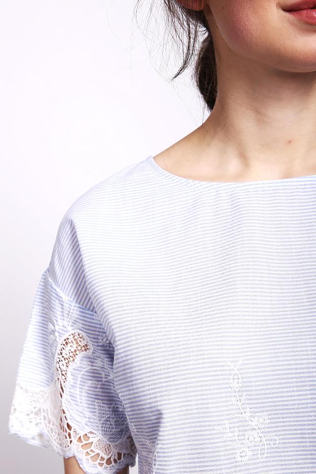Модель выполнена в нежном голубом цвете с тонкой полоской, что делает её универсальной и легко сочетаемой с различными элементами одежды. Блуза имеет округлый вырез горловины.
