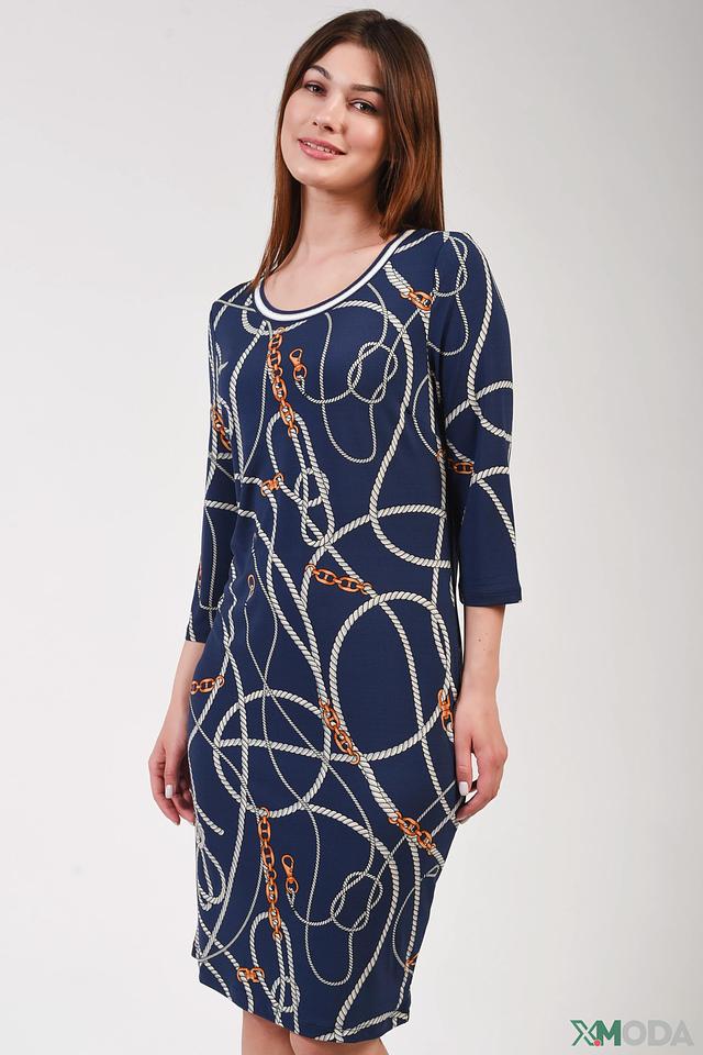Принт представляет собой комбинацию белых и золотистых элементов, имитирующих морские канаты и цепи. Такой рисунок придает платью оригинальность и динамичность. Платье имеет прямой силуэт, который подчеркивает фигуру, не сковывая движений.