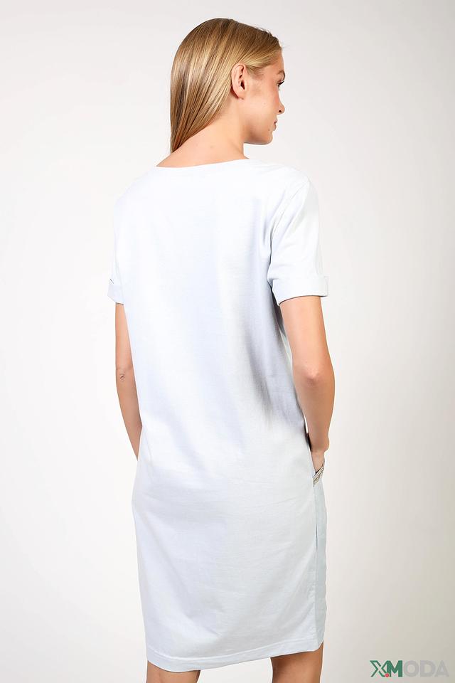 Модель имеет прямой, слегка приталенный силуэт, который подчеркивает фигуру, не сковывая движений. V-образный вырез горловины добавляет изящества, а короткие рукава делают платье идеальным для повседневной носки.