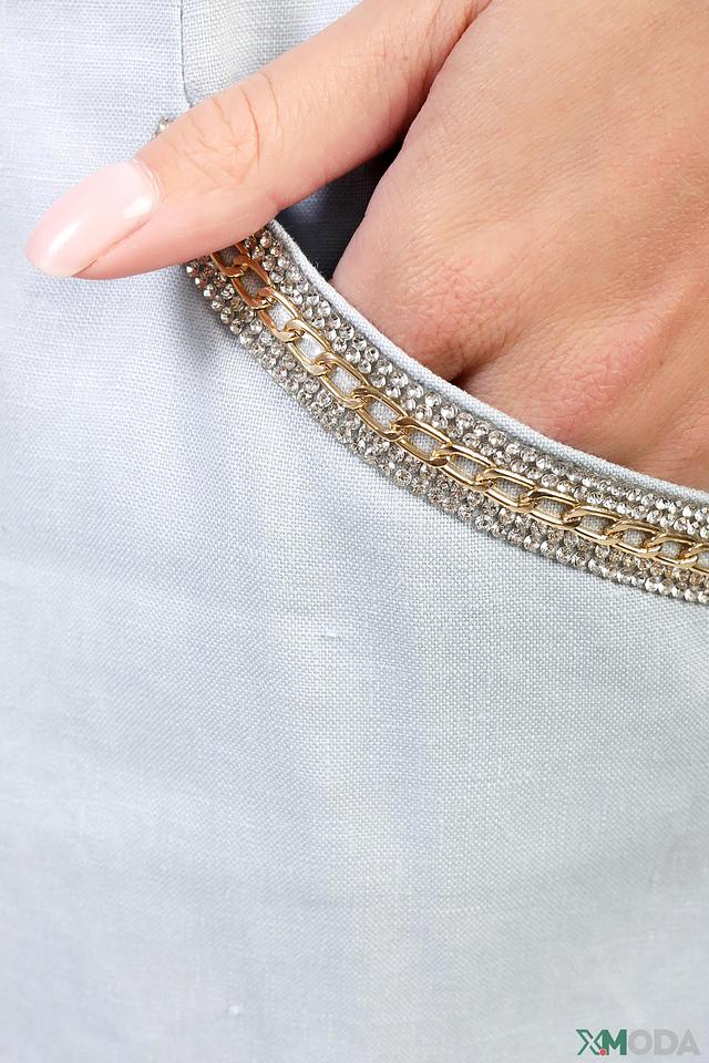 Особенностью данного платья является декоративная цепочка, украшающая накладной карман. Эта деталь придает образу оригинальность и шарм.