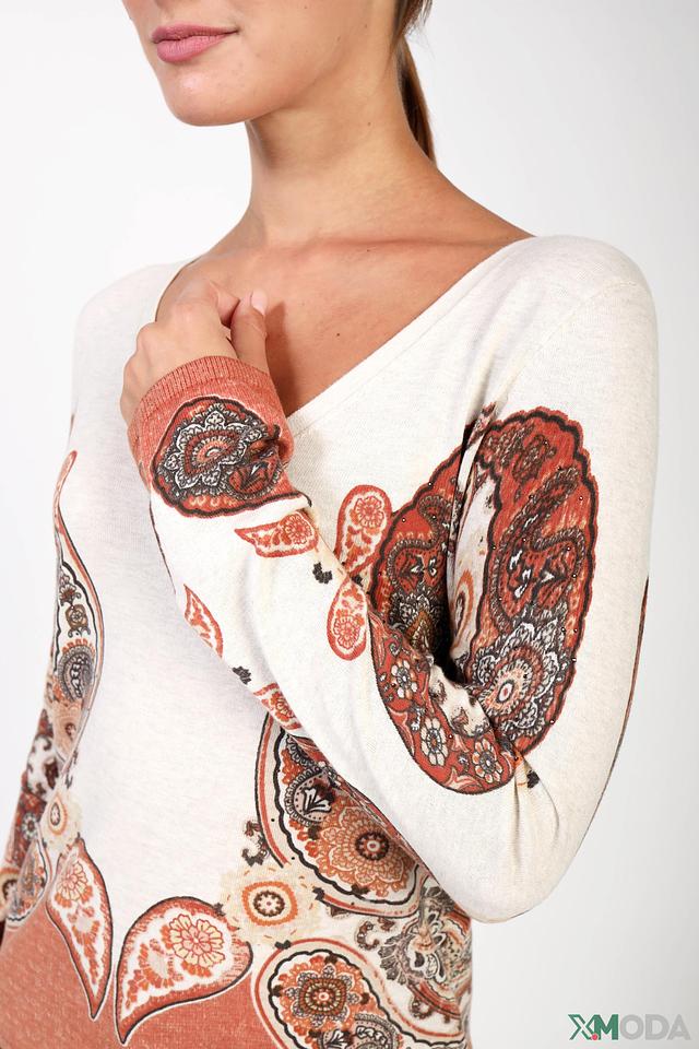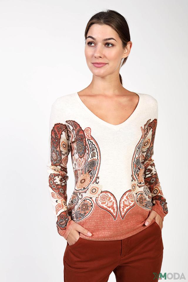 Женский пуловер Oui кремового цвета с оригинальным принтом в стиле пейсли. Модель выполнена из мягкого хлопка и имеет удобный V-образный вырез. Состав: хлопок 100%