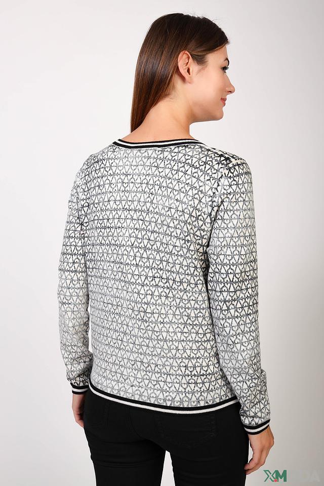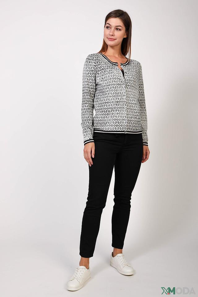 Модель с длинными рукавами и V-образным вырезом застегивается на пуговицы. Отделка манжет и края изделия выполнена в контрастных черных и белых полосках, что добавляет жакету динамичности и завершенности.