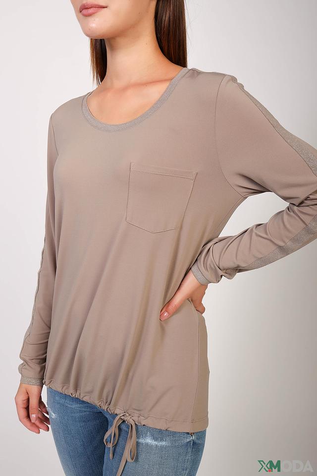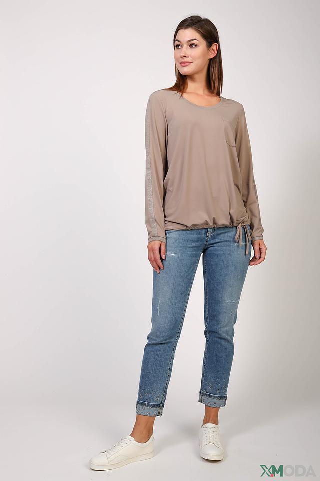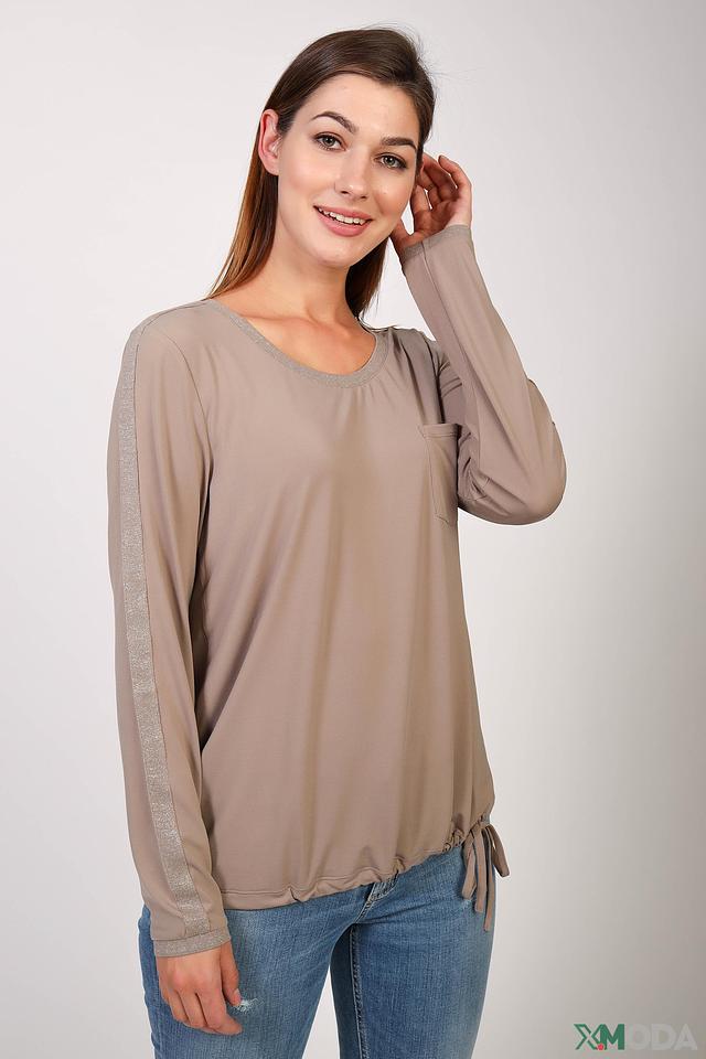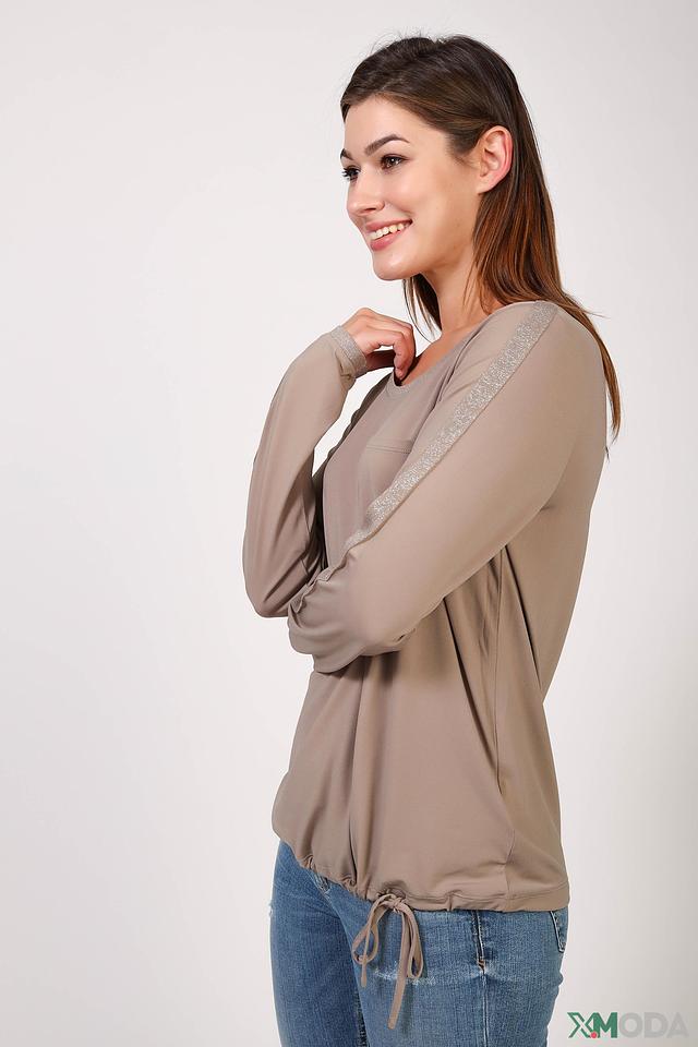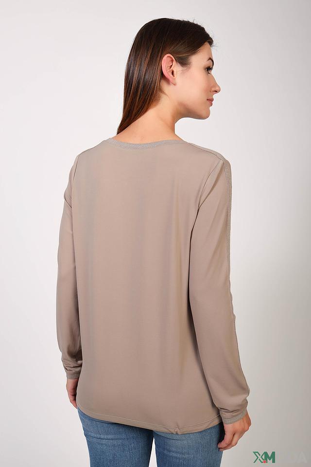Блуза имеет бежевый цвет и украшена блестками на рукавах, что придает ей изысканность и привлекательность. V-образный вырез горловины подчеркивает женственность, а длинные рукава делают ее подходящей для прохладной погоды.