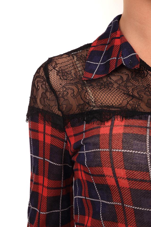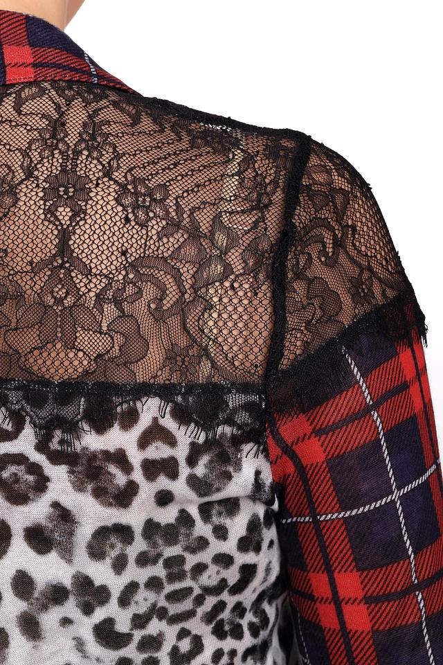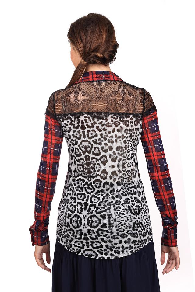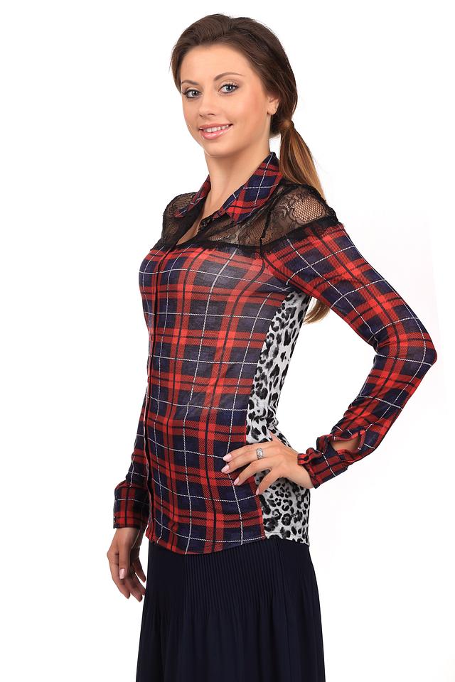 Яркая женская блуза Oui красного, белого и черного цветов. Это изделие было выполнено из вискозы. Данная модель предназначена для демисезонного периода. Дополнено клетчатым и леопардовым рисунком, кружевными черными вставками. Застегивается с помощью маленьких черных пуговиц. Такая рубашка сама по себе является ярким акцентом, поэтому лучше сочетается с однотонными вещами.