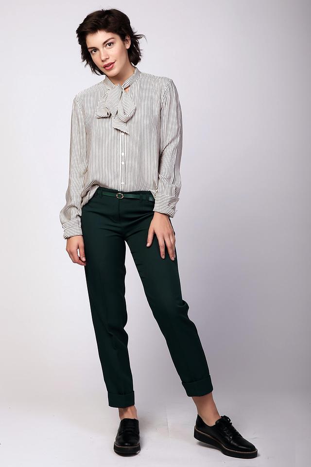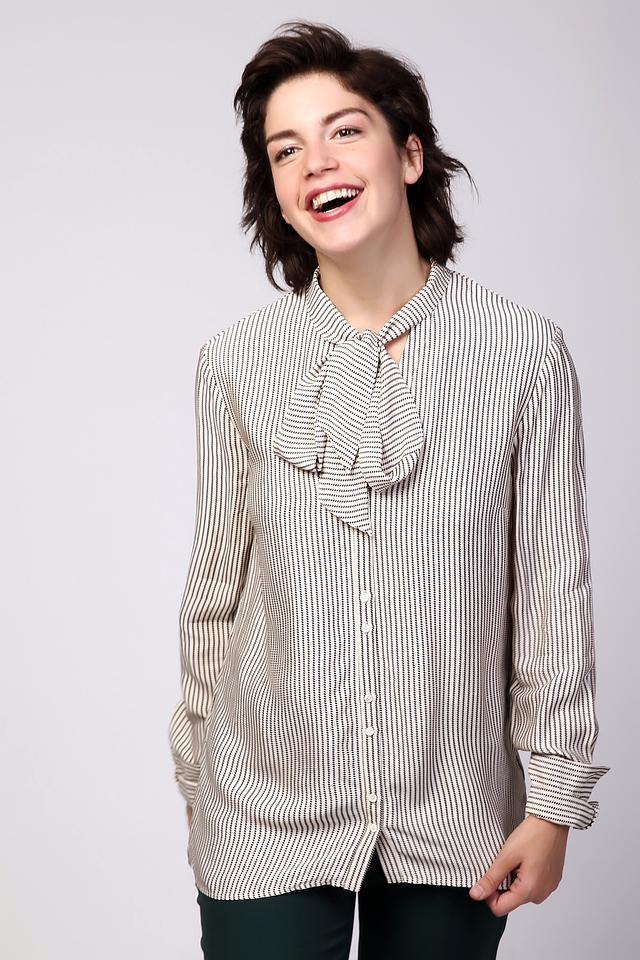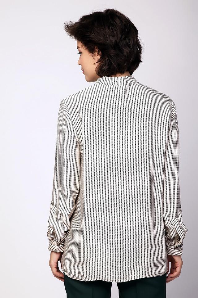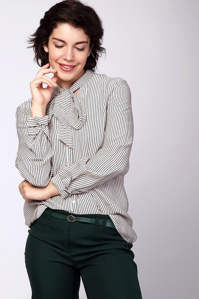 Особенностью модели является воротник с завязкой-бантом, который придает образу женственность и элегантность. Длинные рукава и классическая застежка на пуговицы делают эту блузу универсальной и подходящей для различных случаев.