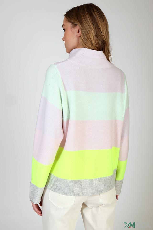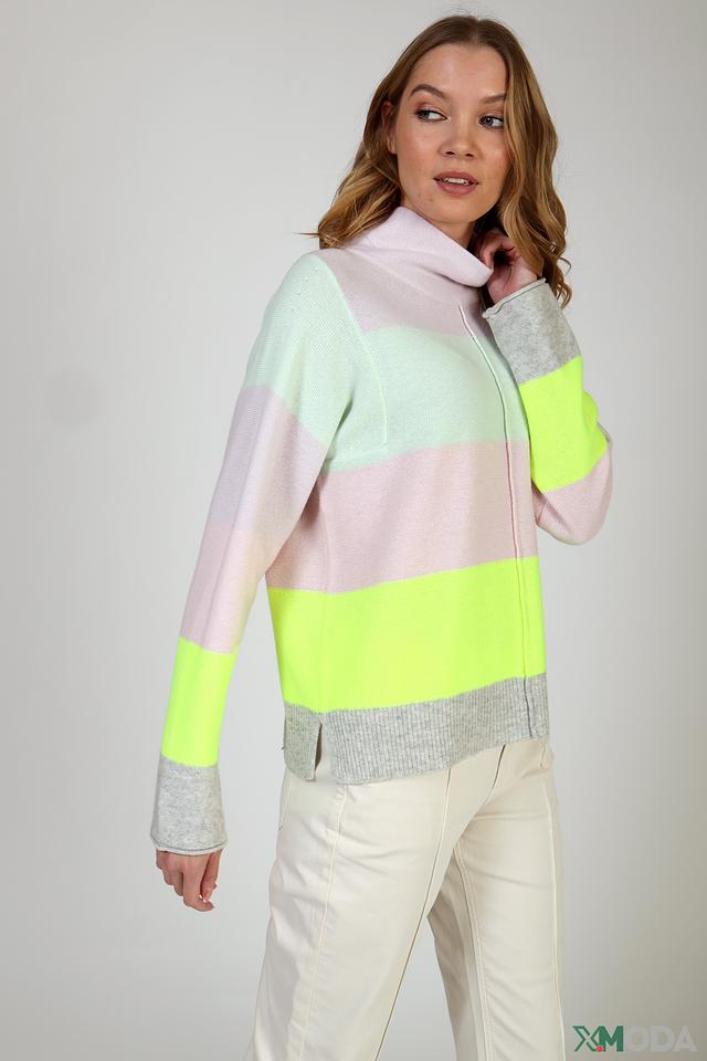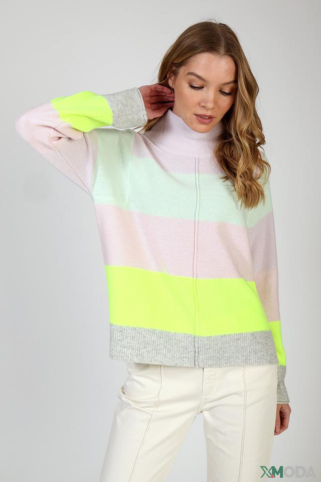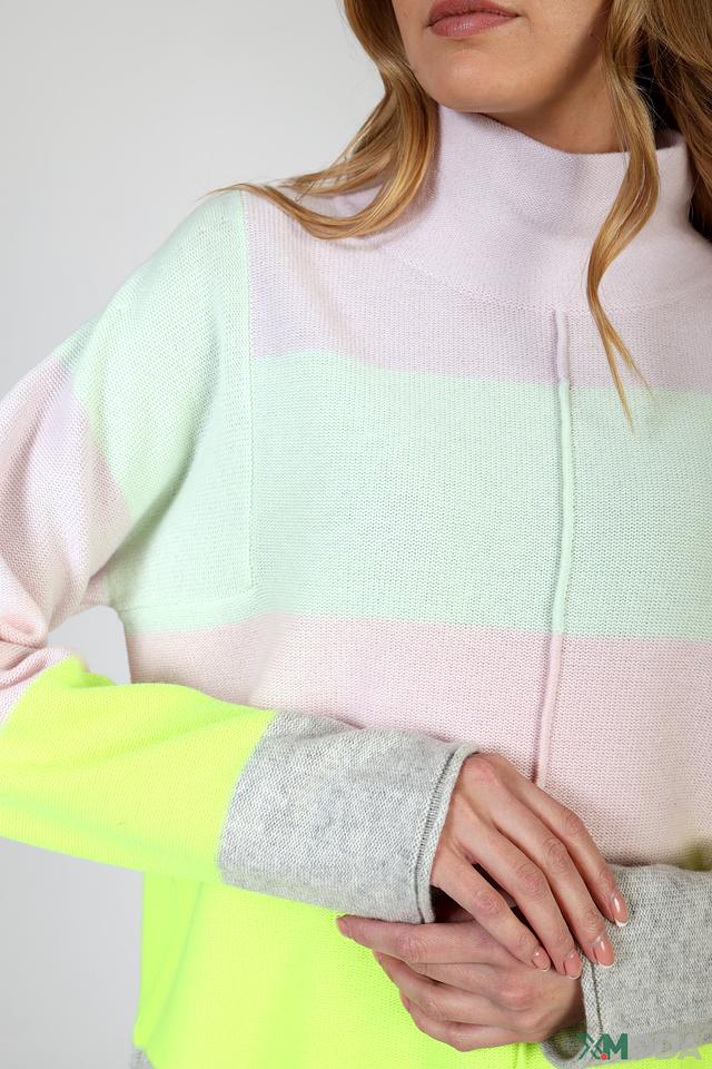 Пуловер имеет полосатый дизайн, сочетающий в себе оттенки лайма, розового, мятного и светло-лилового. Высокий горловина добавляет элегантности, а рукава средней длины делают его универсальным для различных стилей.
