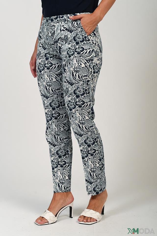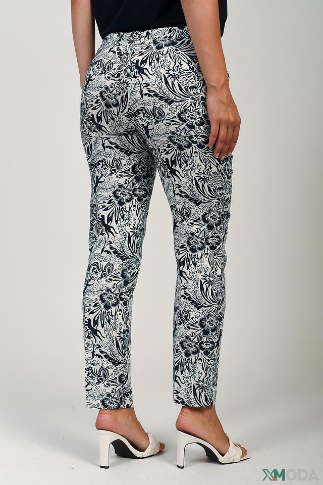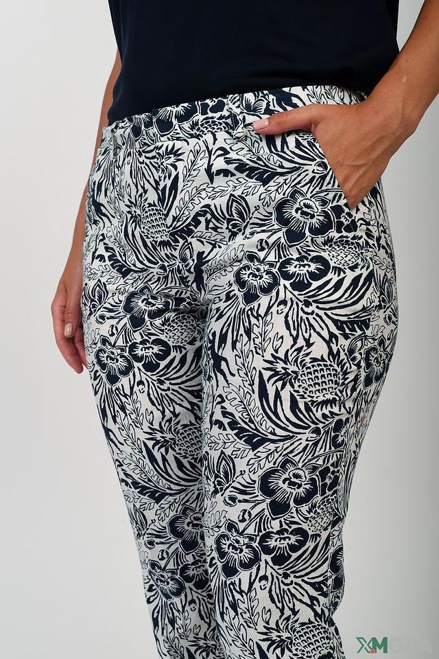 Особенностью модели является яркий цветочный принт в бело-синей гамме, который придает образу женственность и свежесть. Брюки имеют удобный эластичный пояс, обеспечивающий комфортную посадку. Прямой крой и слегка укороченная длина делают их универсальными для создания различных образов.