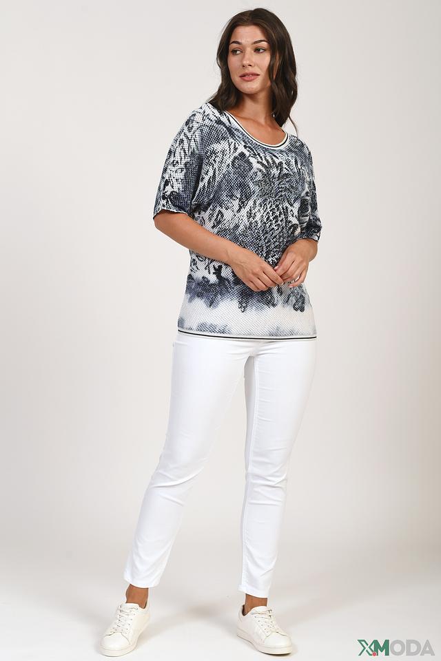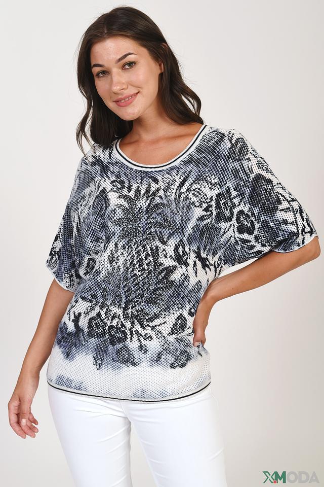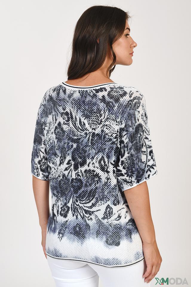Модель имеет свободный крой, округлый вырез горловины и короткие рукава. Пуловер украшен ярким и необычным принтом в синих и белых тонах, который придаёт ему индивидуальность.