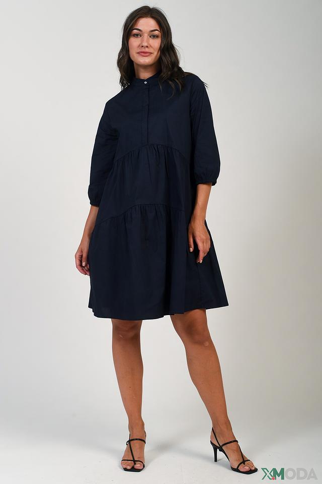 Тёмно-синее платье от Oui выполнено из хлопка с добавлением эластана, имеет рубашечный крой и сборки для создания женственного силуэта. Удобная модель для повседневной носки. Состав: хлопок 95%, эластан 5%