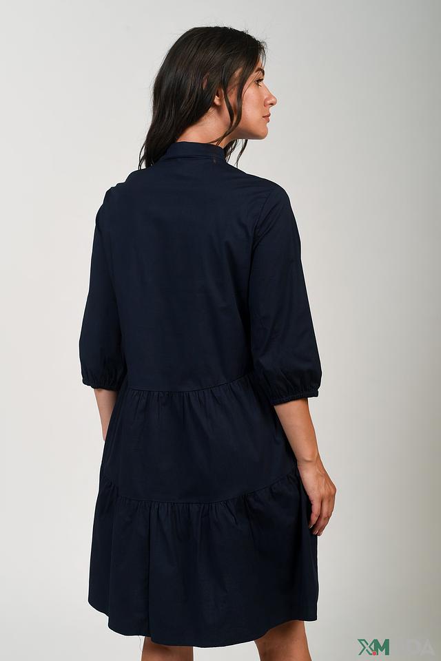 Платье приталенного силуэта с акцентом на талии благодаря сборкам. Юбка платья слегка расклешена, что создает женственный и элегантный образ. Цвет платья – насыщенный тёмно-синий.