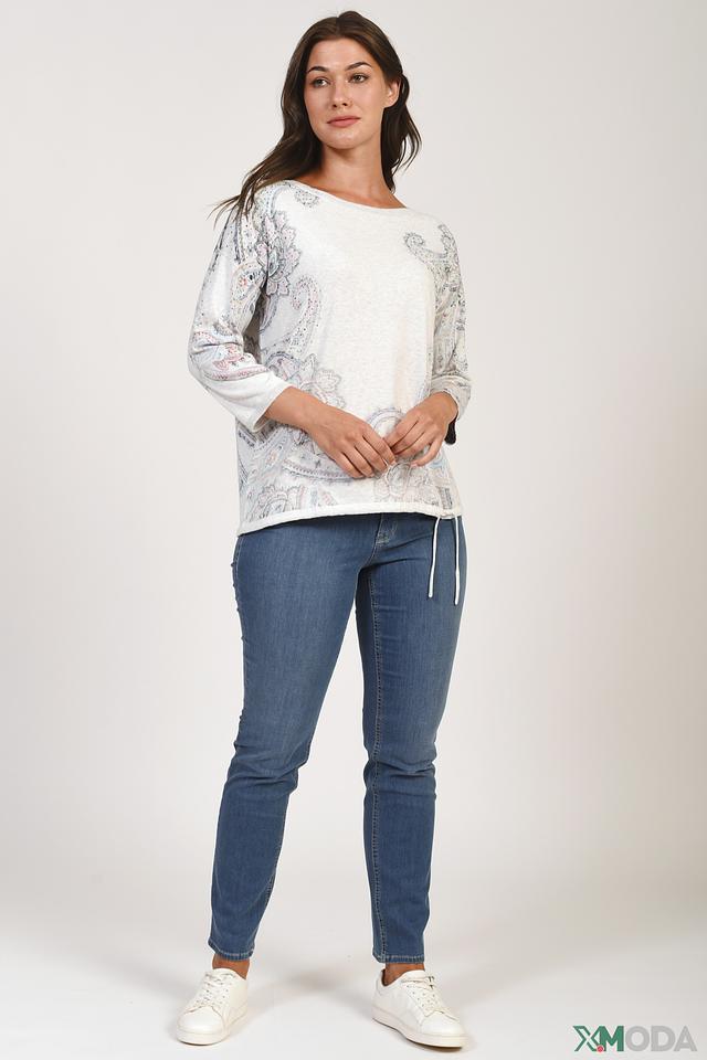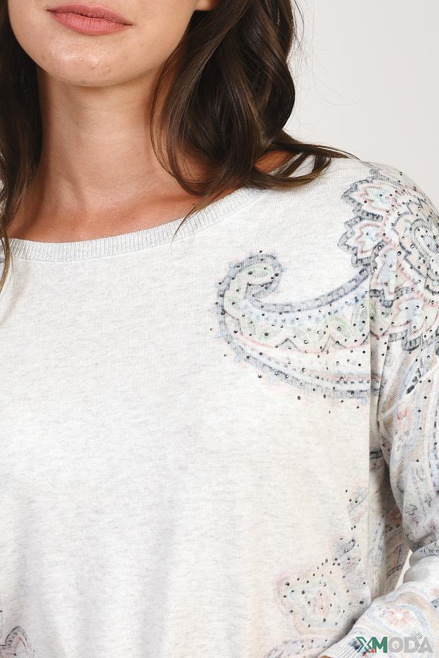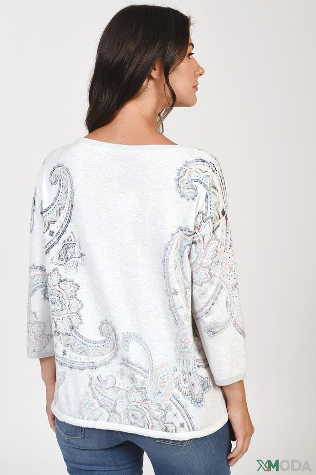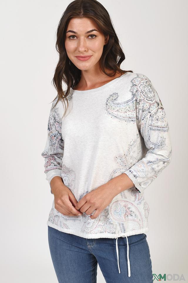 Женский пуловер Oui светло-серого цвета с оригинальным цветочным принтом в стиле пейсли. Модель выполнена из мягкого хлопка и дополнена завязками по бокам для регулировки силуэта. Состав: хлопок 100%