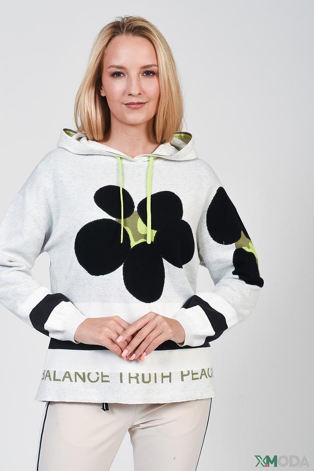 Стильная женская толстовка Oui серого цвета с крупным цветочным принтом. Модель с капюшоном и надписью на груди станет ярким акцентом в вашем образе. Состав: хлопок 100%