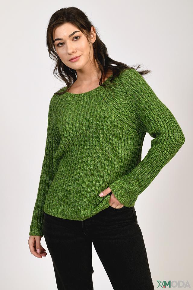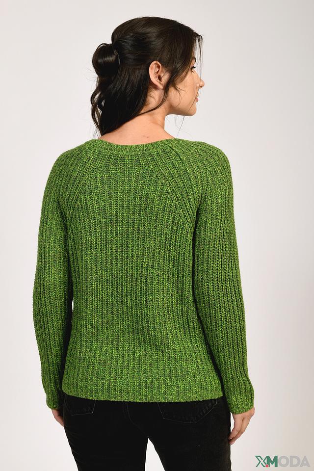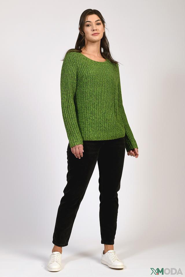 Пуловер имеет классический крой и округлый вырез горловины. Текстурное вязаное полотно придает изделию объём и уют. Преобладающий цвет – насыщенный зелёный, который легко сочетается с различными элементами одежды.