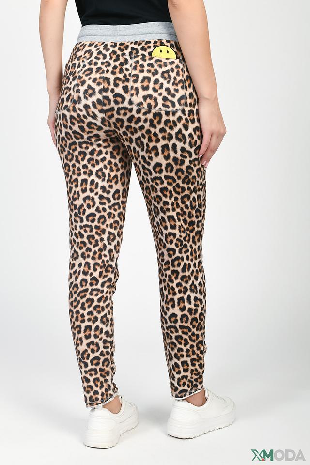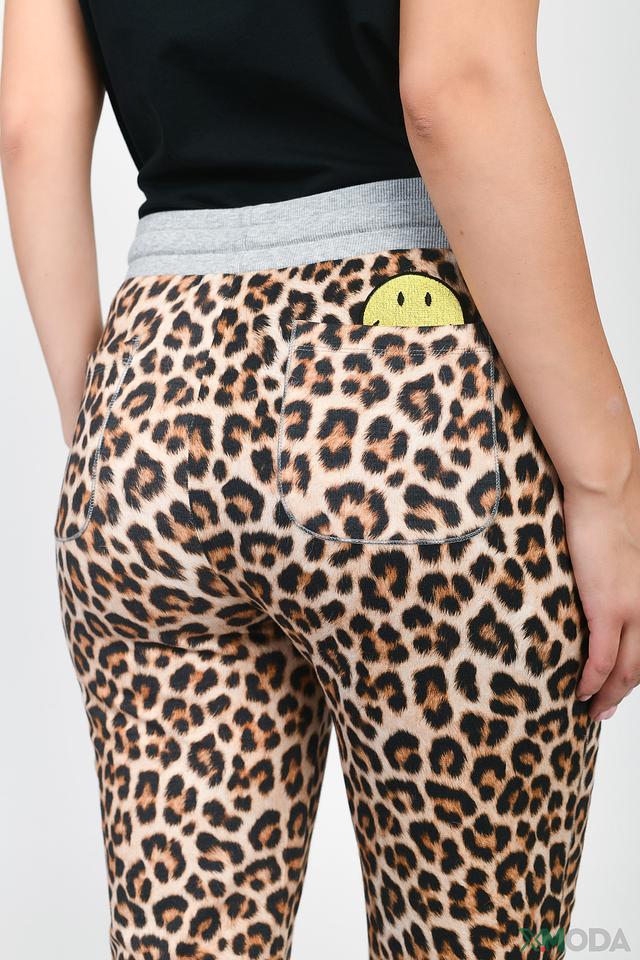 Брюки имеют классический крой с эластичным поясом и боковыми карманами. Оригинальный леопардовый принт добавляет образу динамичности и индивидуальности. На заднем кармане расположено декоративное изображение смайлика.