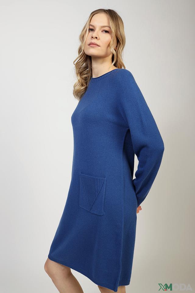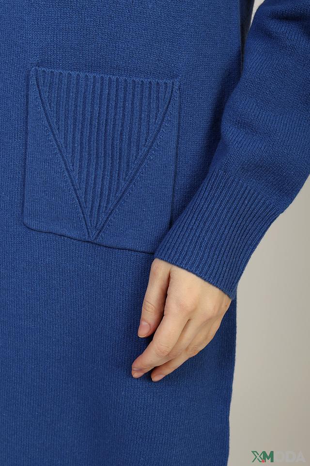 Особенностью этого платья является декоративный вязаный карман на передней части изделия. Он выполнен в виде вертикальных полос и добавляет платью оригинальности.