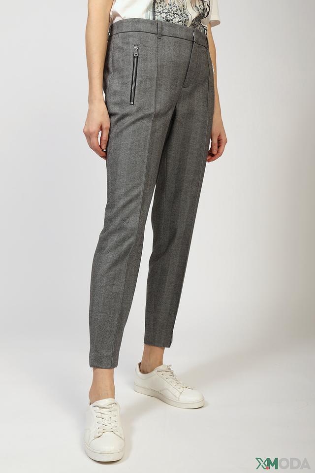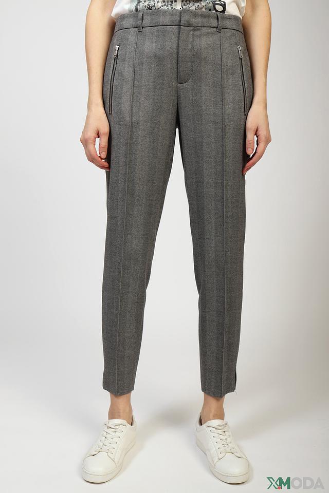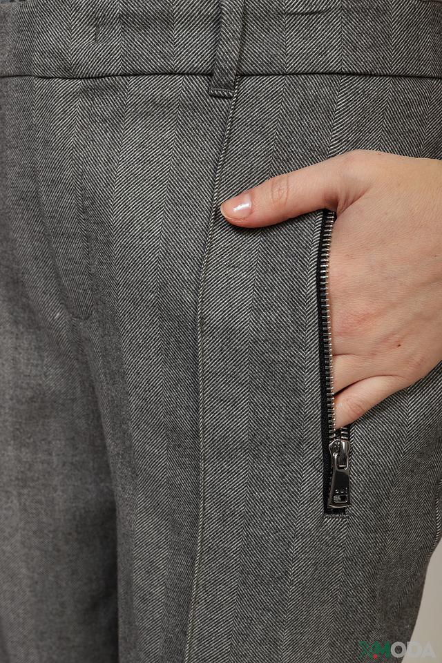 Брюки имеют прямой крой и зауженные книзу штанины, что визуально удлиняет ноги. Высокая посадка подчеркивает талию и создает женственный силуэт. Наличие функциональных молний на карманах добавляет брюкам практичности и оригинальности.
