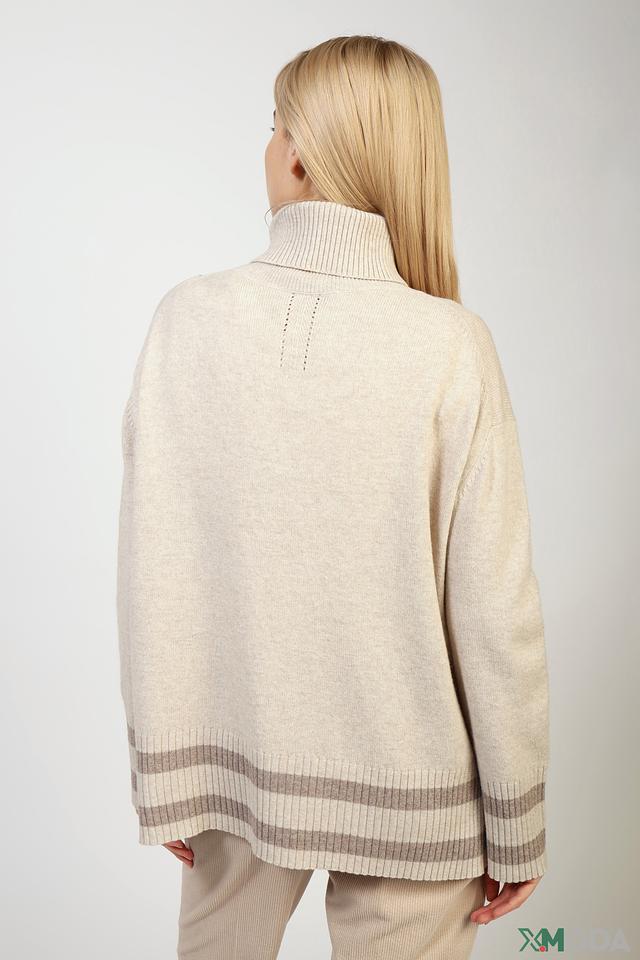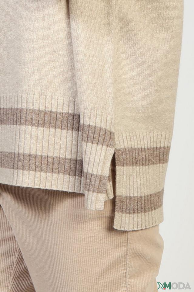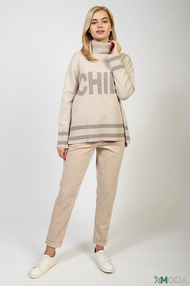 Водолазка имеет бежевый цвет с контрастной надписью "CHIL", выполненной в сером оттенке. Свободный крой не сковывает движений, а полосатая отделка на манжетах и нижней части придает модели особый шарм.