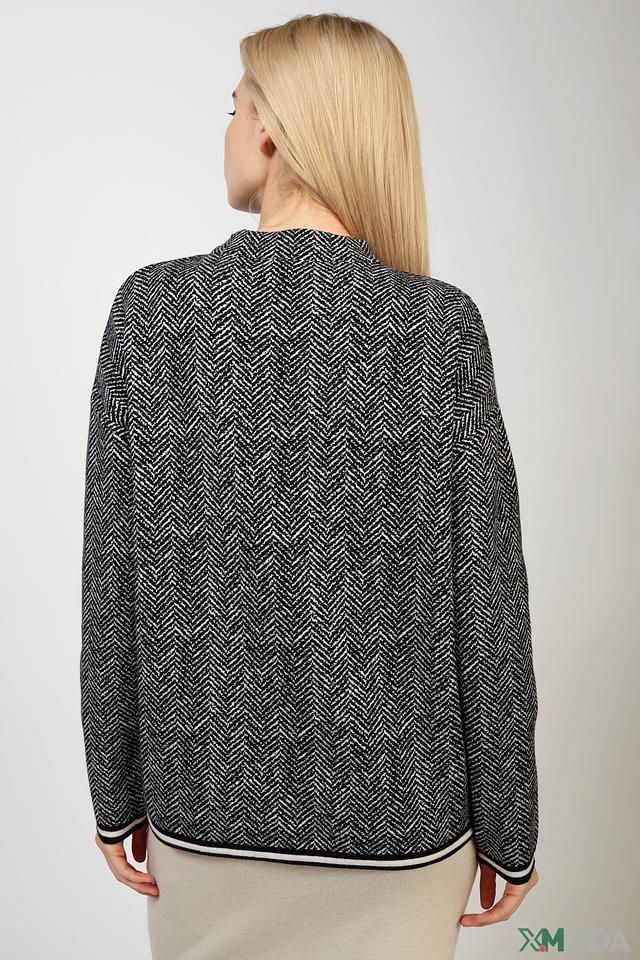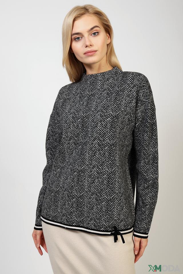 Этот стильный пуловер от бренда Oui выполнен в классическом чёрном цвете и украшен выразительным геометрическим узором в виде "ёлочки". Модель имеет удобный вырез горловины и длинные рукава.