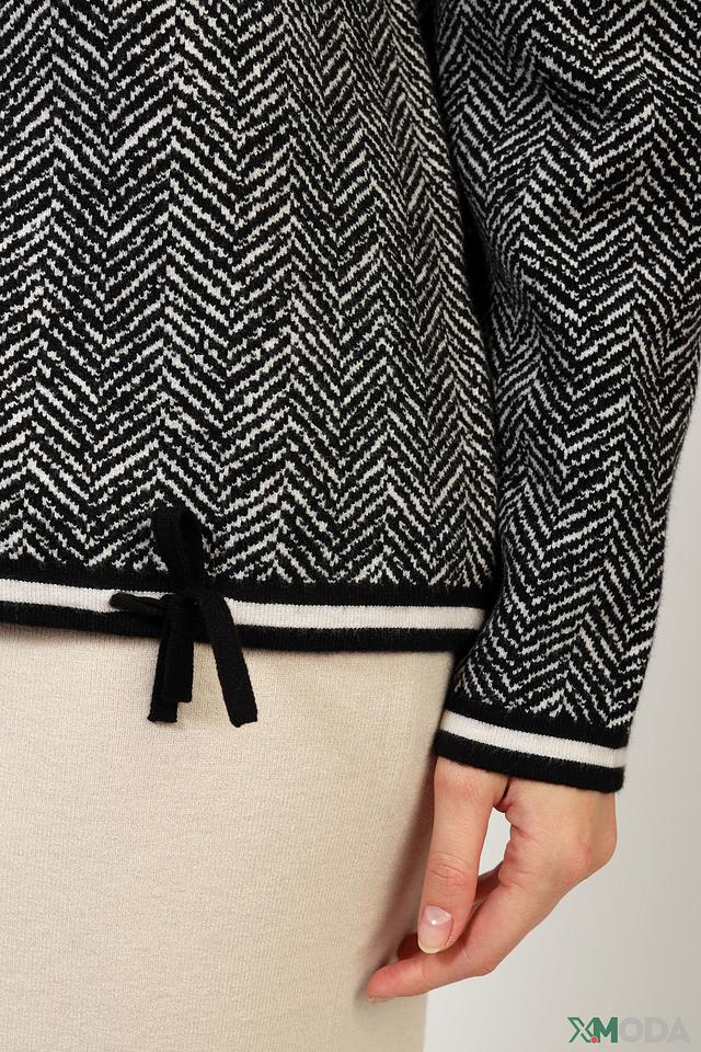 Отличительной особенностью данной модели является эластичная резинка по низу изделия, дополненная двумя чёрными лентами с кисточками по бокам. Этот элемент придает пуловеру оригинальный и завершенный вид.