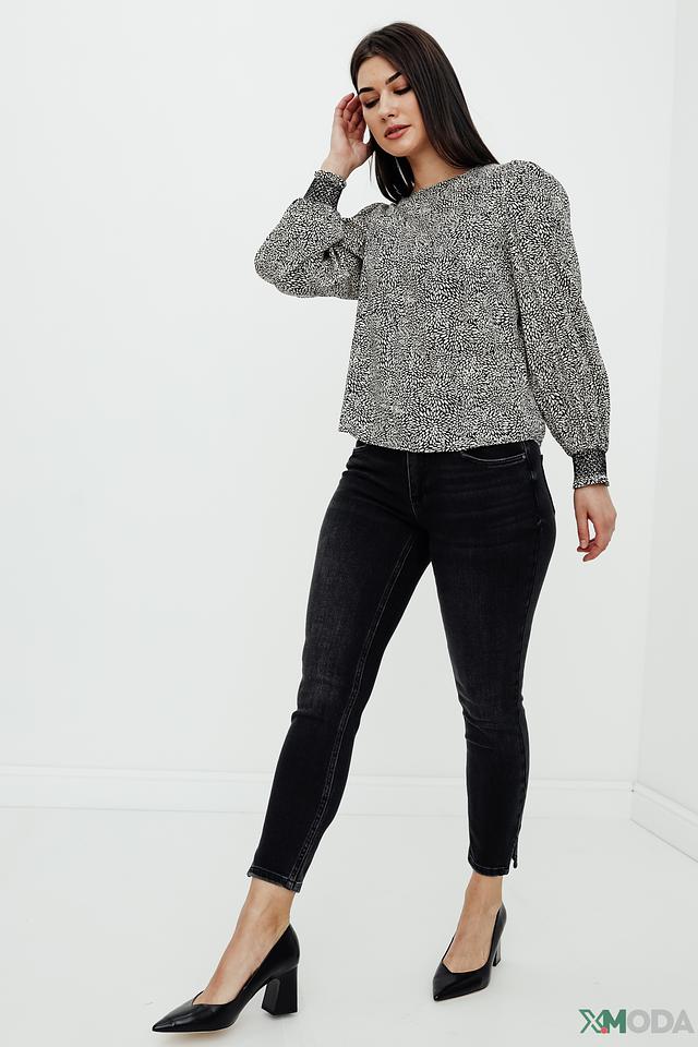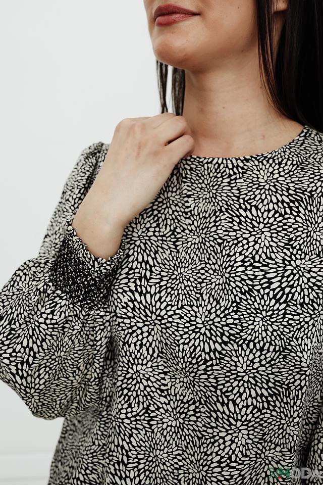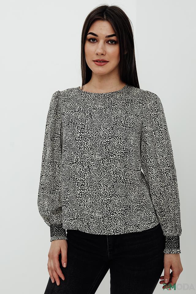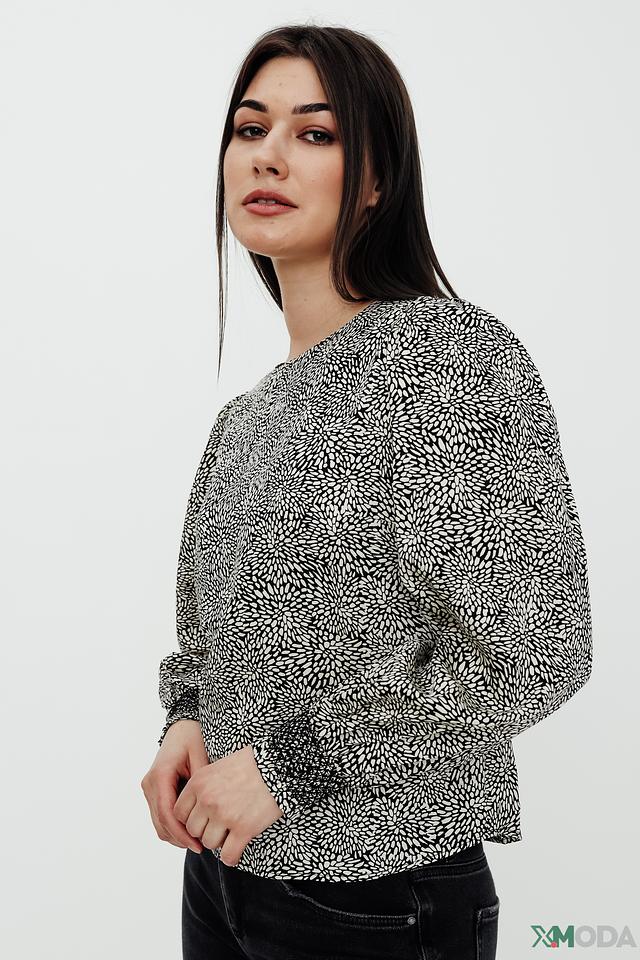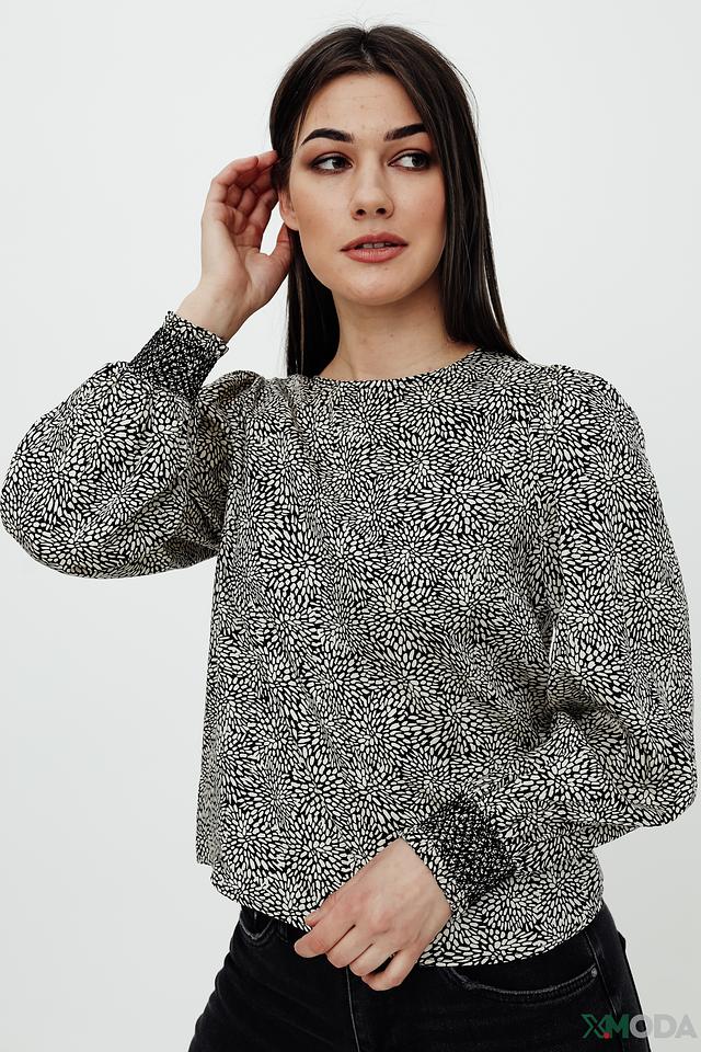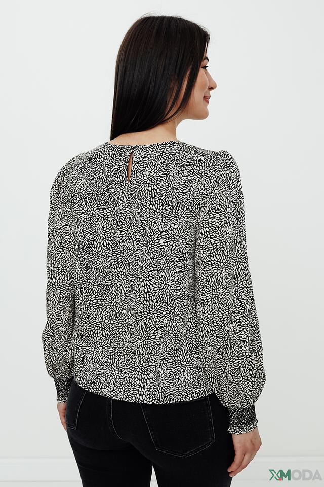 Особенностью данной модели является оригинальный чёрно-белый принт, который добавляет ей выразительности. Округлый вырез горловины и длинные рукава с манжетами создают классический силуэт. Блуза идеально сочетается с джинсами, брюками или юбками.