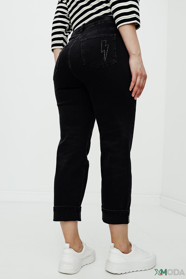 Чёрные джинсы Oui mom fit из плотного хлопка с небольшим добавлением эластана. Модель с высокой посадкой и укороченным кроем, украшенными декоративной вышивкой на задних карманах. Состав: хлопок 98%, эластан 2%