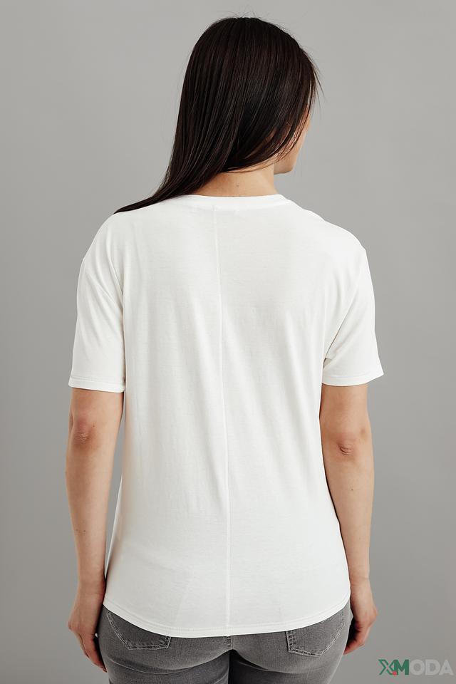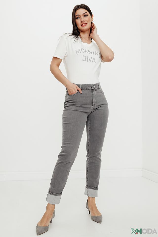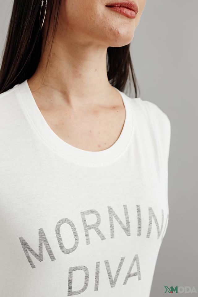 Футболка имеет прямой крой и короткие рукава. Главной особенностью модели является стильный принт "Morning Diva" на лицевой стороне, выполненный в сером цвете. Принт добавляет образу индивидуальность и игривость.