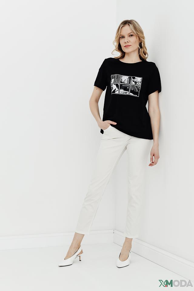 Основным акцентом является яркий принт на лицевой стороне, выполненный в стиле комикса. Принт состоит из нескольких графических элементов в бело-чёрной гамме, что придает футболке современный и динамичный вид.