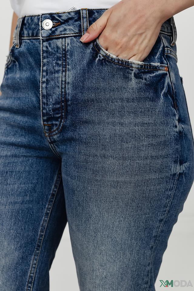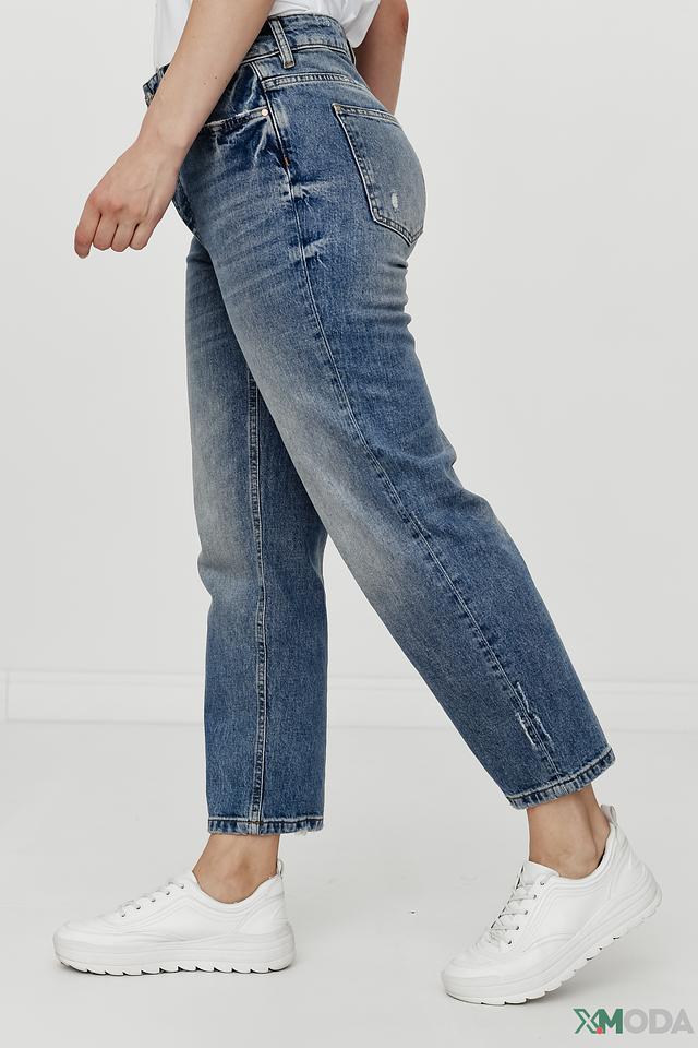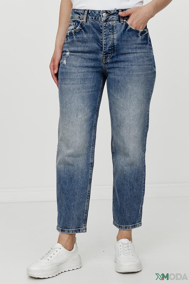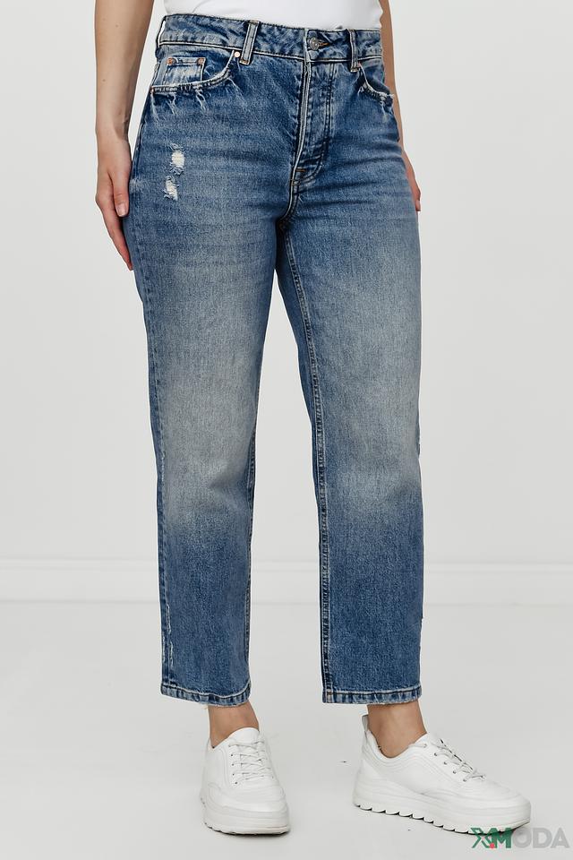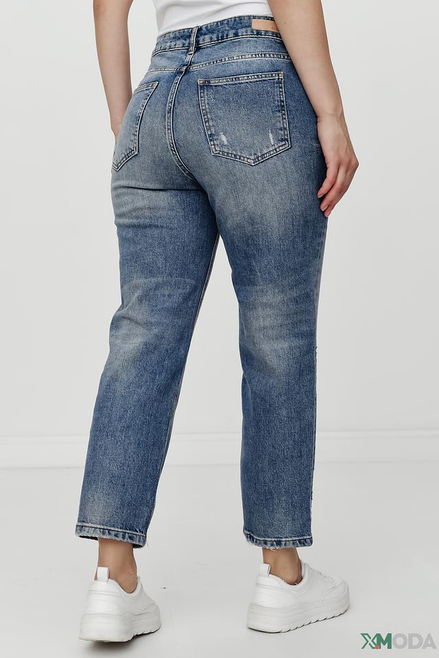 Джинсы имеют прямой крой и классическую посадку по талии. Отличительной особенностью являются декоративные потертости и небольшие разрывы на передней части брюк, придающие им непринужденный и современный вид. Ткань состоит из 99% хлопка и 1% эластана, что обеспечивает комфорт при носке и хорошую посадку по фигуре.