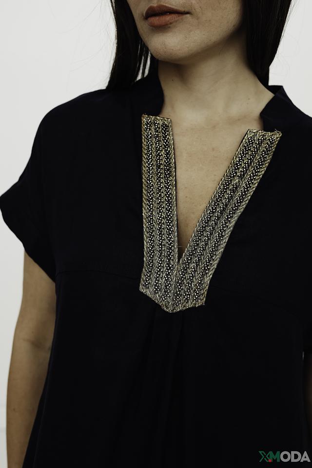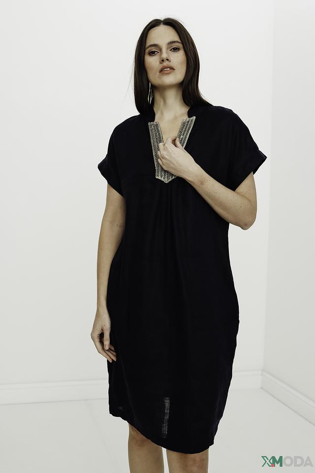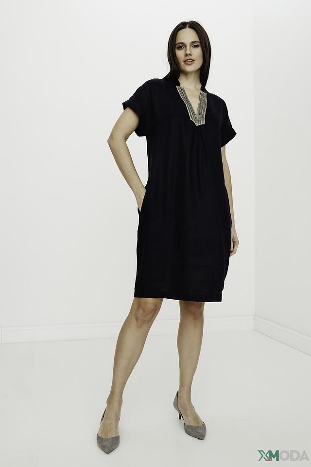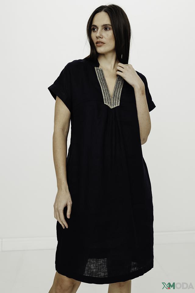 Особенностью этого платья является V-образный вырез горловины, украшенный декоративной вышивкой с использованием золотистых нитей. Короткие рукава и свободный крой делают его идеальным выбором для летних дней. Платье имеет удобные боковые карманы.